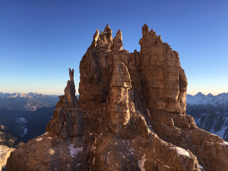 Partiti, e tornati, in bici dal Lago d’Antorno l’intera uscita è durata 13 ore. Dopo aver proseguito a piedi, le due guide alpine hanno deciso di partire dalla Cima Grande, e non dalla Cima Ovest come avevano programmato, perché la progressione è statà più difficile del previsto a causa della neve, che arrivava fino al ginocchio.