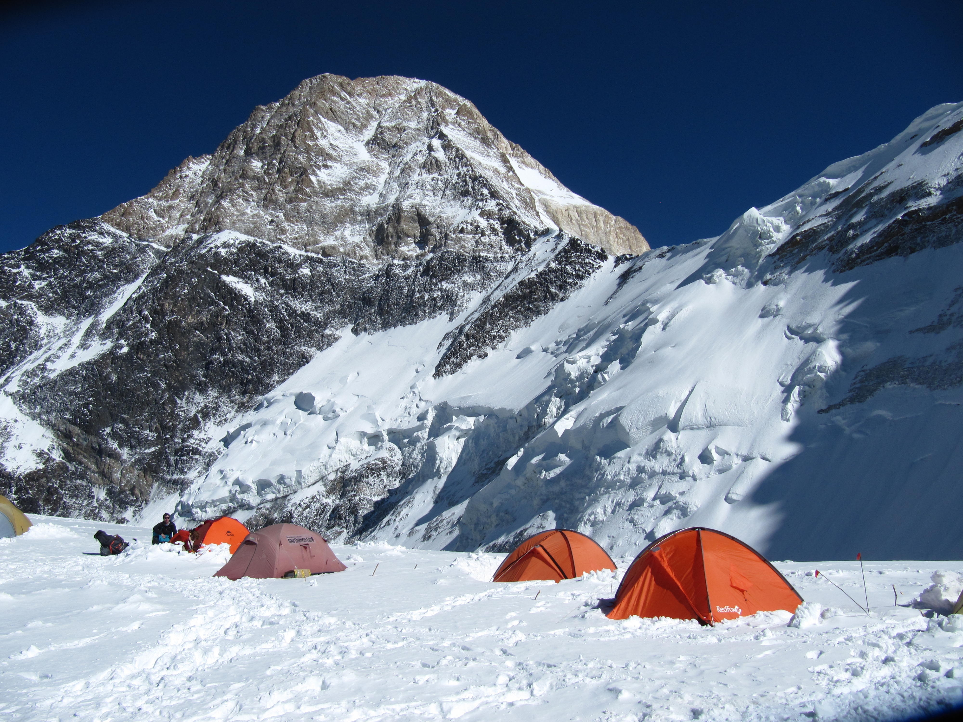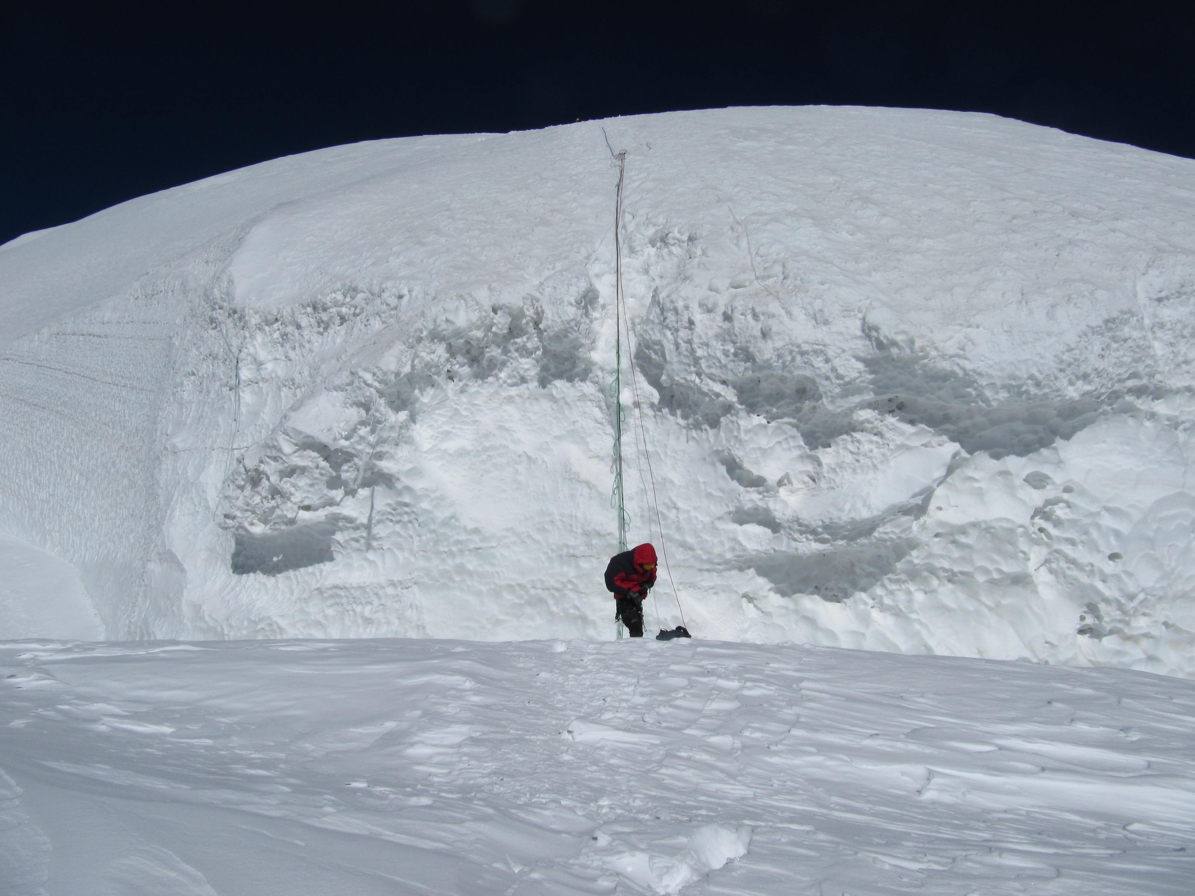 La salita al campo 1 è prima su un pendio nevoso ad alto rischio di slavine sulla parete nord poi si sposta sulla cresta nevosa e il campo si trova su roccette in una zona al riparo da scariche di ogni tipo. Scegliamo il campo 1 alto più tranquillo e meno affollato a 4500 mt. Il campo 2 invece si trova a 5500 su una sella nevosa più esposto al vento ma in posizione abbastanza sicura, l’unico pericolo oggettivo è una grossa cornice di neve sul pendio superiore. Dal campo 1 si arriva al campo 2 percorrendo una cresta su corde fisse in parte su roccia e su neve con pendenze marcate. Dopo 6 giorni in quota e dopo aver attrezzato il campo 2 rientriamo al Campo Base ma Francesco già da qualche giorno continua a ripetere che vuole rinunciare alla vetta, teme che i suoi scarponi siano troppo leggeri e ha paura di congelarsi le dita dei piedi. I piedi sono i suoi e io non posso convincerlo del contrario.