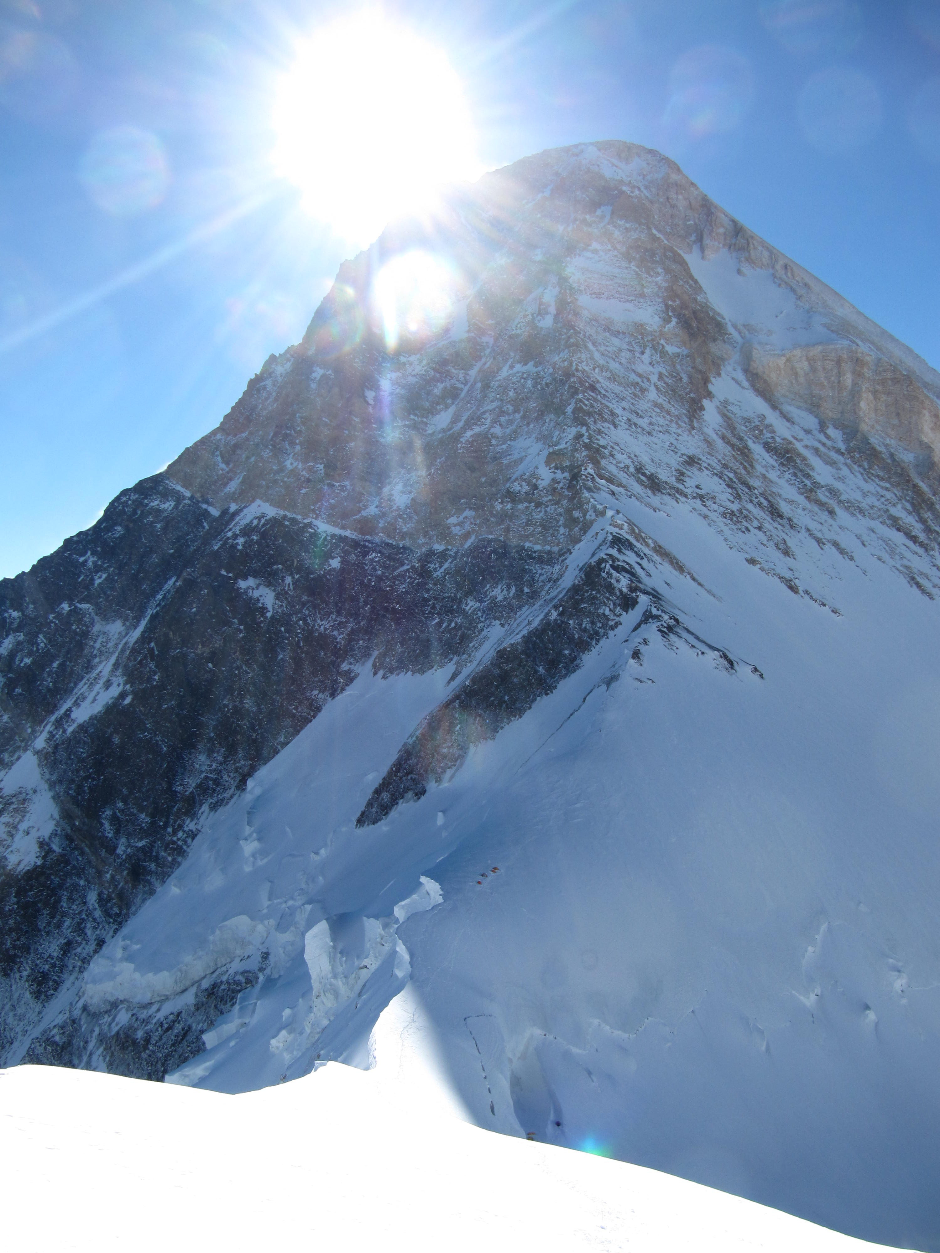 Decidiamo quindi di dedicare ancora due giorni per risalire al campo 2 e poi scendere per testare gli scarponi e un ultimo trasporto di cibo prima di tentare la salita. È qui che al campo 2 incontriamo per l’ultima volta Ivan con il quale scambiamo due parole sulla salita in vetta che lui tenterà la notte di due giorni dopo. Sembra molto affaticato, l’acclimatamento per lui è stato sicuramente più duro visto che non è mai ridisceso al campo base ma è determinato e soprattutto inconsapevole dell’incidente che gli accadrà da lì a poche ore. Noi siamo consapevoli invece di aver commesso un errore nel trovarci al campo 2 senza tutta l’attrezzatura necessaria per la salita in vetta, stiamo bene, il tempo è sicuramente buono ancora per due o tre giorni e potremmo partire anche noi dal campo 2 senza invece dover ridiscendere per poi ripartire, ma così avevamo deciso e ora dobbiamo rispettare le scelte fatte nei giorni precedenti. Più volte penso che questa leggerezza nella programmazione ci potrà costare il prezzo di non salire in vetta. Nel frattempo diamo assistenza a un iraniano sceso dalla vetta che ha perso 8 dita al K2 completamente fulminato dalla quota che sta cercando l’“office“ convinto di poter recuperare una parte del materiale che aveva depositato al campo 2. Scendiamo guardando la cima e tutti i team pronti per partire per la vetta: avremmo potuto essere anche noi al campo 3 quella stessa sera e invece no.