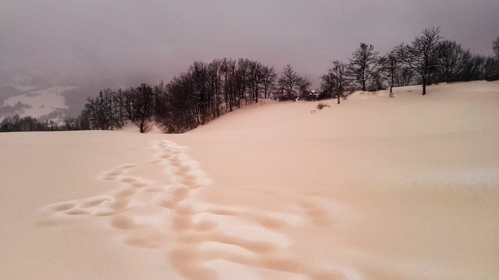 Siamo nell’Appennino sull’Appennino tosco-emiliano. Nulla però di cui preoccuparsi, infatti il colore rosa è dato dalle polveri del deserto trasportate dalle correnti africane.
