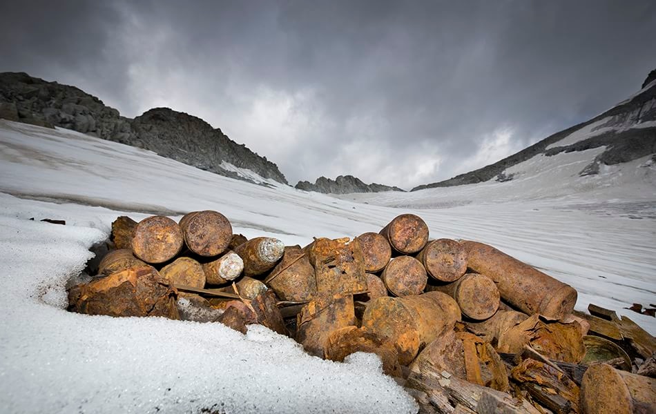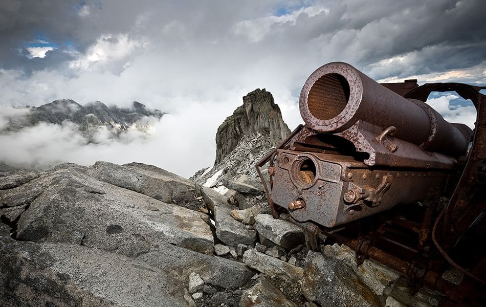 «Il fotografo ha dedicato tre anni a percorrere la linea del fronte, sulla lunga cresta di confine tra il Passo dello Stelvio e l’altopiano carsico, dove le truppe austro-ungariche e italiane si affrontarono in zone impervie in cui mai si era combattuto, fino a 3.000 metri di altitudine, tra le cime e i ghiacciai delle Alpi centrali e orientali. L’itinerario del fotografo, accompagnato dall’alpinista Marco Ganola, segue le tracce lasciate dalle migliaia di uomini mandati a combattere e a morire in condizioni proibitive: trincee, baracche, gallerie scavate nella roccia, postazioni di combattimento, ma anche armi e oggetti personali ritrovati in quota, testimonianza di uno degli eventi più tragici della storia dell’umanità».