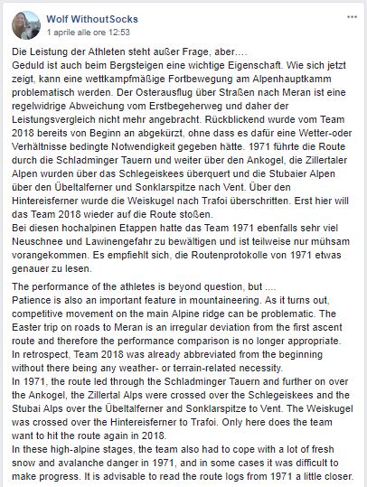 Secondo Caroline Hoi – che su Facebook appare come Wolf WithoutSocks – pur essendo fuori discussione la prestazione atletica del team, questa competizione con la spedizione del 1971 non è più considerabile tale, in quanto «il tracciato seguito nel giorno di Pasqua sulle strade di Merano è una deviazione irregolare dalla prima via di salita e quindi il confronto delle prestazioni non è più appropriato».