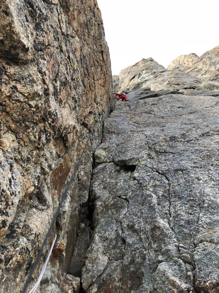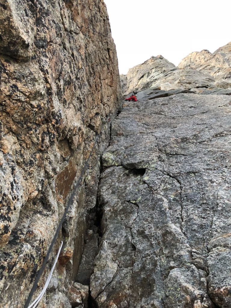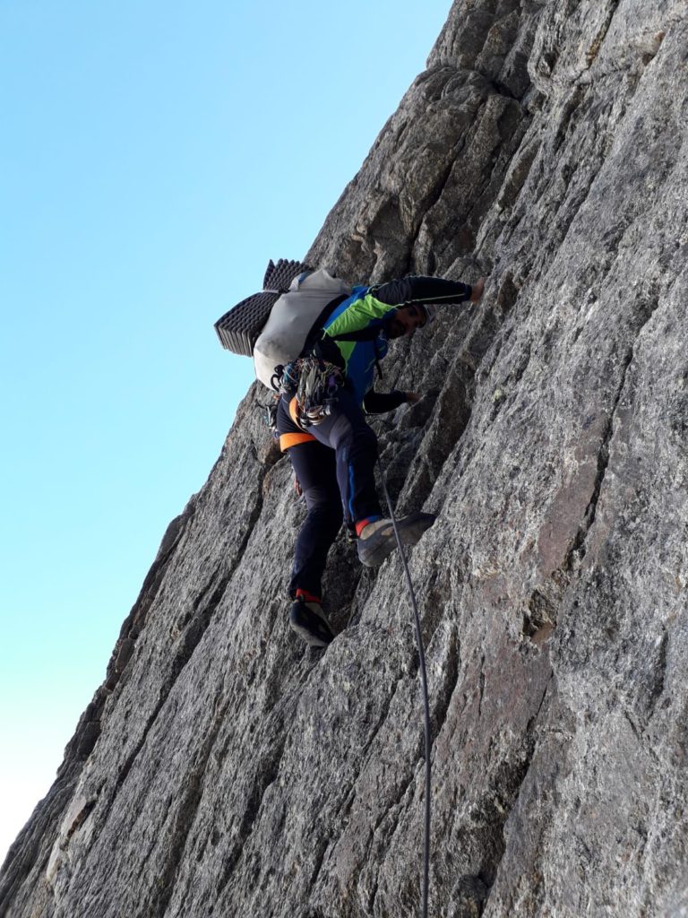 Un tiro dopo l’altro Bacci e Moroni hanno ricordato la prima salita di questa via. “Abbiamo pensato a Cassin, Tizzoni ed Esposito in continuazione. Era impossibile non ricordarli a ogni passaggio, non pensare all’attrezzature con cui sono andati in vetta”. Armati solo di corde di canapa e con pochissime informazioni a disposizione i tre, battuti sul tempo da Harrer e compagni sulla Nord dell’Eiger (loro originario obiettivo), hanno raggiunto la parete e hanno iniziato a salire trovando solo nei primi metri tracce di un tentativo precedente. “Sono stati veramente degli assi” commenta Moroni ripensando a quel che i tre han portato a termine.