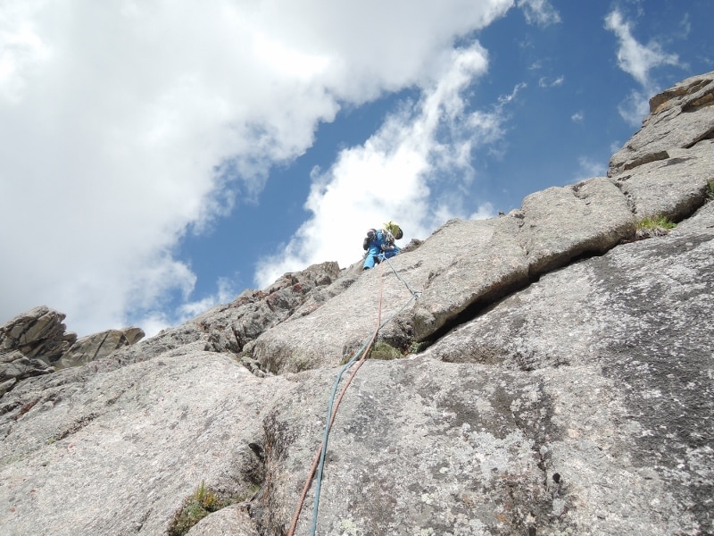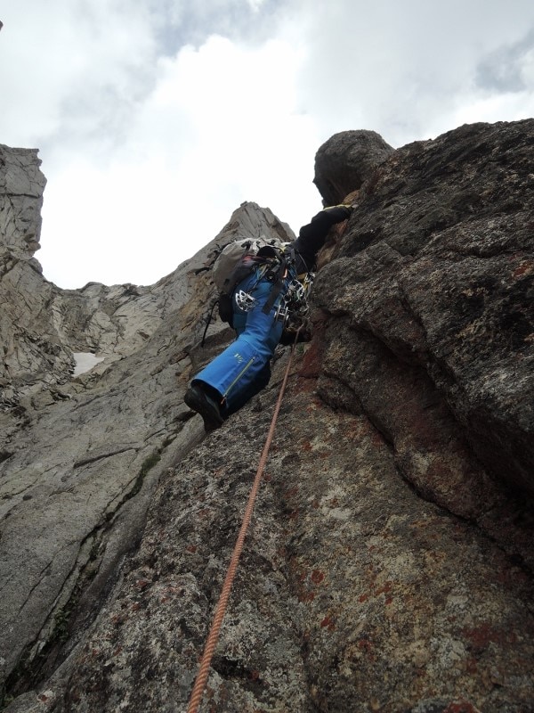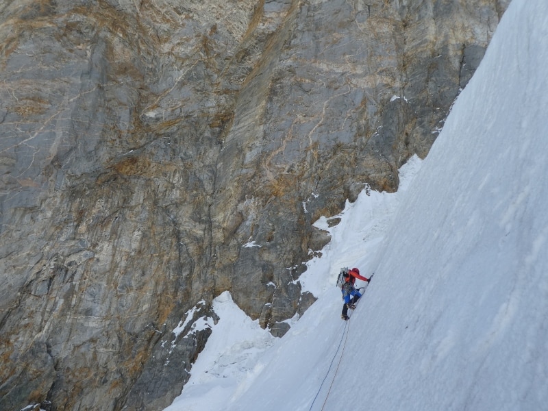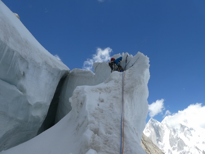 Il gruppo si muove il 17 agosto alla luce delle frontali, scalano su roccia superando numerosi tiri che raggiungono il settimo grado e con zaini belli pesanti. Superata la parte di roccia raggiungono il ghiacciaio superiore dove, un’imponente seraccata, porta i tre ad avanzare tra affilate creste a cui seguono crepacciati pendii e neve da battere. Sanguineti, Cavalli e Focchi scalano per oltre 27 ore consecutive quando, finalmente, sbucano sulla cresta terminale a circa 5850 metri di quota. La salita è riuscita, ma per gli alpinisti si preannuncia un bivacco senza materiali per proteggersi dal freddo.