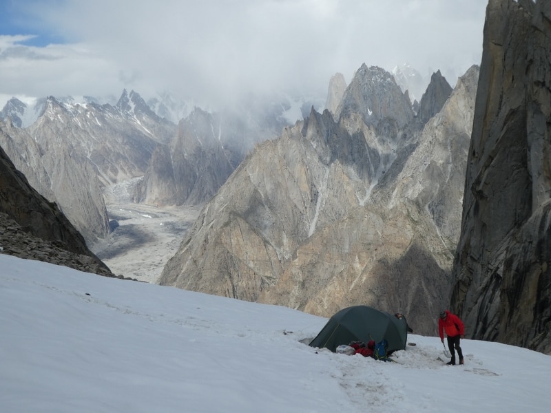I tre, partecipanti alla spedizione Trans Limes capitanata da Daniele Nardi, dopo i primi giorni passati a studiare la parete Sud-Est del Link Sar, obiettivo principale della spedizione, hanno deciso di cambiare meta per dedicarsi a una salita su roccia in una zona a sinistra del Link Sar e del K6. “La parete Sud-Est era molto secca e ogni tanto capitavano giornate di nevischio che, come risultato, peggioravano ulteriormente le condizioni” spiegano. “A dimostrarlo ci sono anche le testimonianze dei tre americani Steve Swenson, Chris Wright e Graham Zimmerman che per due settimane hanno lavorato sulla montagna senza però riuscire a concludere molto”. Viste le condizioni e i tempi della spedizione i tre han così deciso di rinunciare alla parete per dedicarsi a qualcosa di fattibile nei giorni ancora a disposizione. “Uno dei soci di Swenson aveva scattato alcune foto in alta definizione alla zona in cui ci interessava scalare e ce le ha passate. Ci siamo così messi a studiarle individuando una linea che poi abbiamo deciso di salire. Ovviamente abbiamo sottovalutato di gran lunga l’avvicinamento che pensavamo di poche ore ma che in realtà si è trasformato in qualcosa di penoso con tanto di bivacco per arrivare sul pianoro glaciale” scherzano i tre ricordando la spedizione che si è svolta nel corso dell’agosto 2017.