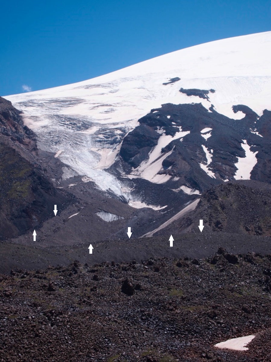 Sulla sua sommità e sui suoi versanti sono presenti numerosi ghiacciai. Si tratta di una classica calotta sommitale da cui si dipartono radialmente quattro lingue glaciali. Una scende, senza copertura detritica, sul versante occidentale; due (Ghiacciaio Parrot e Ghiacciaio Cehemmen) fluiscono sul versante Nord-Est, mentre la quarta, senza una denominazione ufficiale, scende sul versante Sud-Ovest, non lontano dall’itinerario principale di salita. Queste ultime tre sono caratterizzate da una copertura detritica continua con spessori superiori ai 20 cm, che non solo influisce sulla fusione del ghiaccio e quindi sull’evoluzione dei ghiacciai, ma ne ha impedito nel passato un’accurata delimitazione.