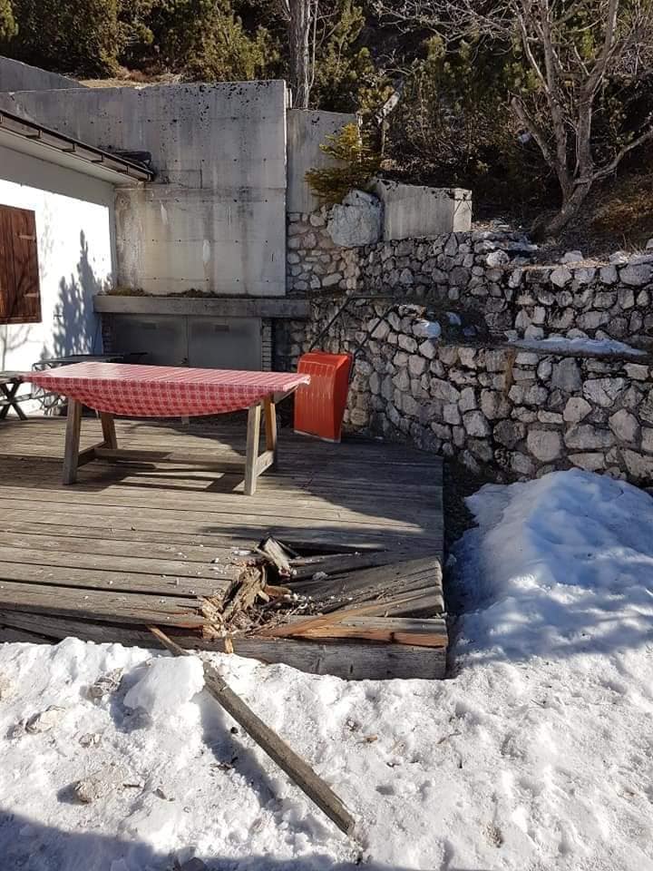 La struttura, costruita nel 1979 da Gianni Palatini Zotèlo insieme al figlio Ferruccio a 1.580 metri di quota, tra i gruppi dell’Antelao, delle Marmarole Occidentali e del Sorapiss e ancora oggi gestita dai loro discendenti, ha riportato ingenti danni. Il masso è difatti entrato nell’edificio fermando la sua corsa in una delle camere da letto.