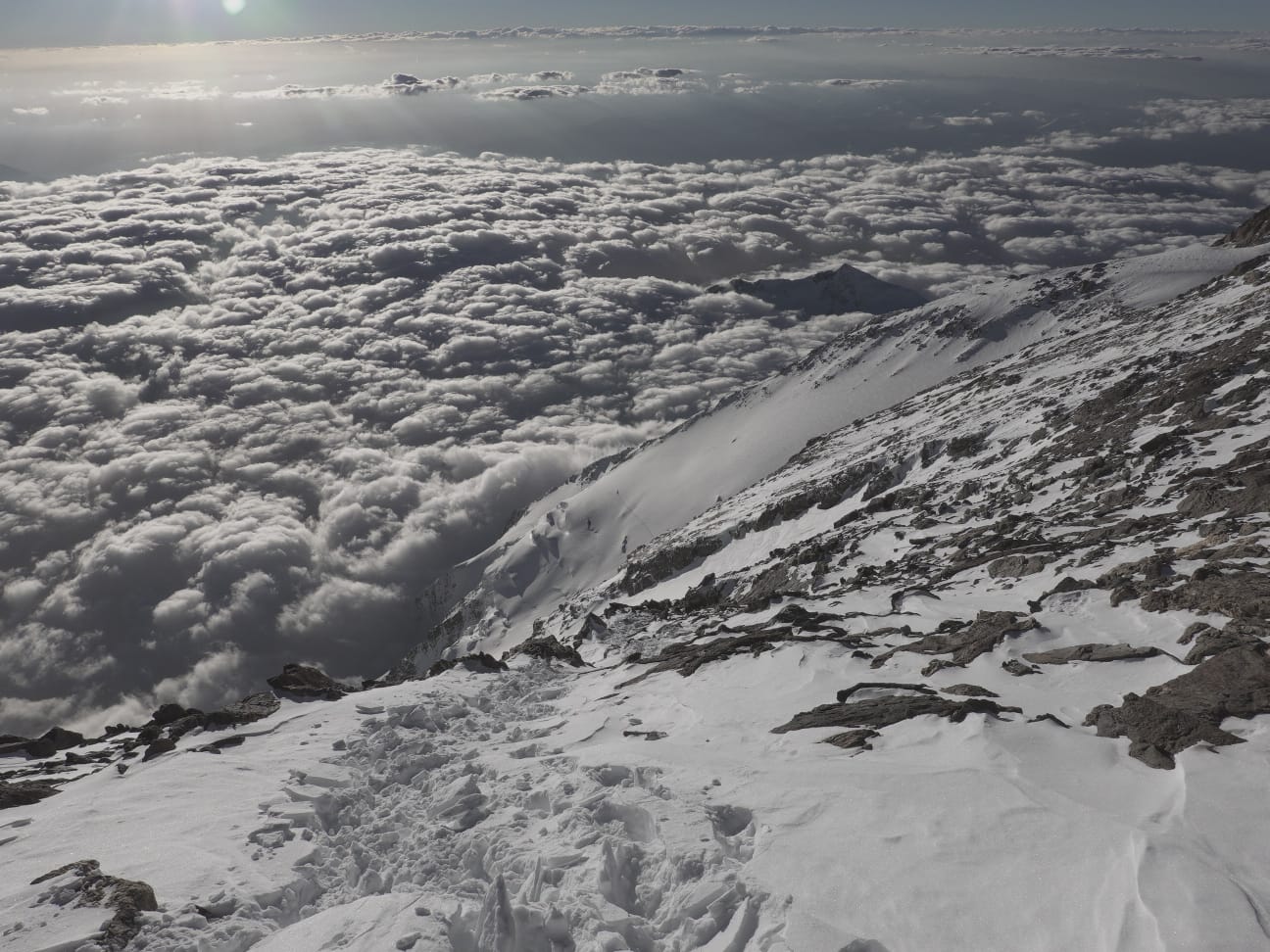 Uno zoccolo di ghiaccio sotto gli sci, difficile da togliere. Per questa ragione Carlalberto “Cala” Cimenti è rimasto a lungo fermo a pochi passi dalla vetta del Nanga Parbat, mettendo in allarme familiari e amici e mobilitando la macchina dei soccorsi. “Ero bloccato, fermo, con uno zoccolo incredibile di neve e ghiaccio sotto entrambi gli sci, a un’altezza superiore agli 8mila metri e stava venendo buio. Vitaly mi guardava da poco più in basso, aspettando di vedere cosa avrei fatto”. Lo snow leopard piemontese non ha intenzione di mettere i ramponi rinunciando a questa discesa, così inizia un lungo lavoro al coltello per eliminare l’incrostazione ghiacciata. “Non provavo rabbia o sconforto, cercavo unicamente di terminare il lavoro il prima possibile, stando però attento a farlo bene. Mi dispiaceva solo per Vitaly che era lì ad aspettarmi. Non ero nemmeno preoccupato: le previsioni di Filippo Thiery non davano brutto tempo in arrivo, non c’era vento forte ed ero vestito bene” ci spiega Cala, che finisce il lavoro di pulitura a buio ormai fatto. La sciata inizia alla luce della frontale, su una neve che non è un granché, ma poco importa: “Stavo sciando il Nanga Parbat ed ero sopra gli 8mila metri. Faccio una curva, poi un’altra, la neve è cartone, ma va bene lo stesso: è bellissimo”. Cala scia fino a raggiungere Anton Pugovkin, mentre Vitaly Lazo decide di togliere gli sci intorno ai 7800 metri a causa della neve “non proprio facile e che stacca delle placche insidiose”. Alla fine anche Cimenti toglierà gli sci dopo aver raggiunto Anton e aver ricompattato il gruppo: “Ho fatto ancora un timido tentativo di far rimettere loro gli sci”, ma non c’è stato verso di convincerli. I tre sono una squadra, “ed era meglio tornare insieme al C4; così ho tolto anch’io gli sci, anche se so che lo rimpiangerò per sempre”.