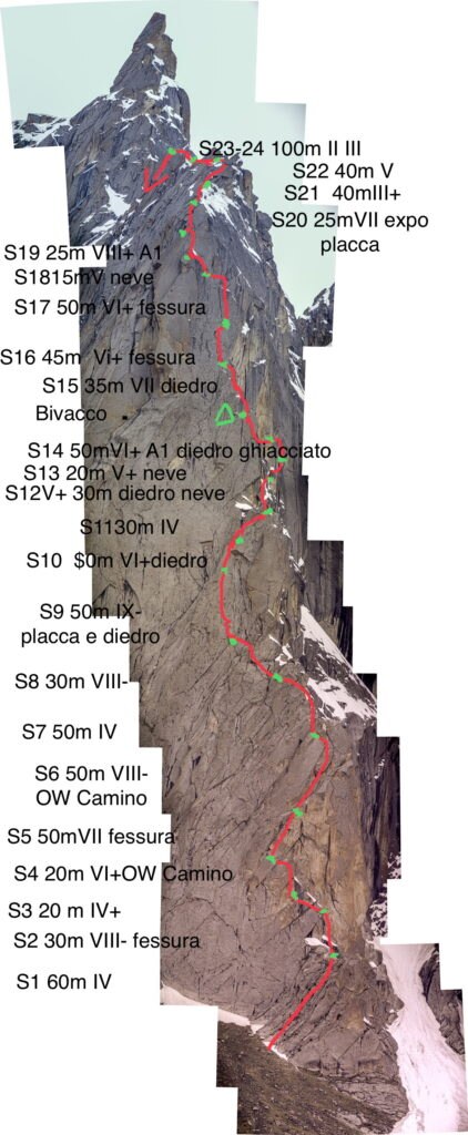 “Alle ore 19 per fortuna Matteo arriva a un fantastico bivacco, quindi tramite contatto Radio sentiamo Mauri e David che dopo aver fatto una decina di tiri, alcuni su fessure con dell’erba, si sono stufati e hanno rinunciato”. Matteo e Max continuano invece la loro salita il giorno seguente per sei o sette tiri in fessura “fino all’VIII grado con una breve sezione di A2 e infine una placca a cristalli di VII alta 25 metri, esposta e senza protezioni poi, finalmente, si arriva sulla cresta”. Da qui i due dovrebbero iniziare la salita del monolite che porta verso la cima della montagna. “Ci sembra impossibile salire, forse ci vogliono spit o per lo meno sono assolutamente necessari scarponi, ramponi e piccozze”. Ecco allora che arriva la scelta di rientrare verso valle “terminando la via a metà della lunga cresta” e dedicandola alla natura “che ci ha dato l’opportunità di salire clean senza trafiggere la linea elegante con chiodi o spit per 850 metri di scalata e 700 metri di dislivello fino alla quota di 4850 metri circa”. Tracciato che i due hanno chiamato, per l’appunto, Ma Ma Natura.