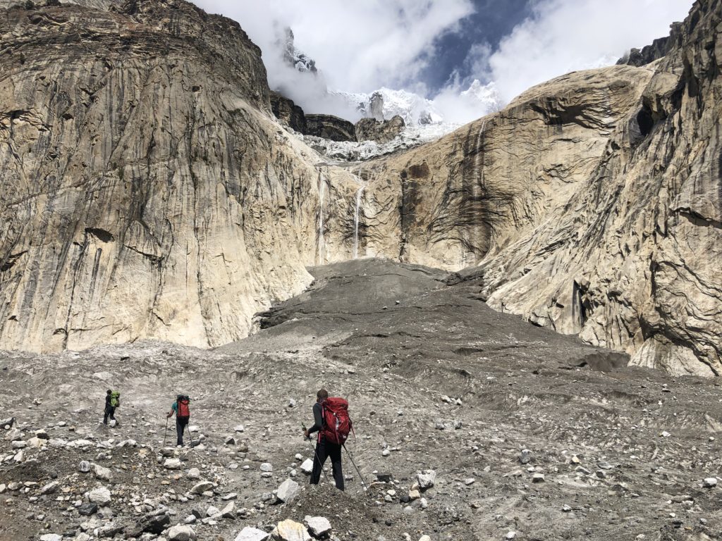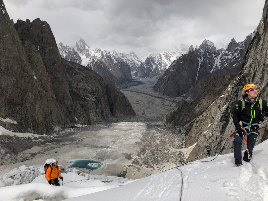 “Visto che non possiamo andare dove vogliamo chiediamo consiglio all’ufficiale di collegamento Omer, obbligatorio in queste zone, sulla direzione che avremmo potuto prendere” spiega Faletti. “Lui ci dà un paio di opzioni, non le più comode”. Così, armati di tanta voglia di salire i ragazzi partono “per una di quelle torri che si trovano di fronte al campo base e che già Daniele Nardi e Tom Ballard avevano battezzato ‘Alison Peak’. Io faccio coppia con Matteo mentre Maurizio con David”. Un lungo avvicinamento su detriti morenici li portano sotto le torri, dove riposano una notte prima di iniziare la salita. “Maurizio e David si spostano tramite cenge sulla direzione di un monolite, sito sulla cresta del paretone di granito largo circa 2 chilometri ed alto circa 950 metri. Matteo ed io andiamo invece sullo spigolo Est”. Tutte e due le cordate hanno poco materiale: due serie di friends fino al 2 ed un 3 e un 4 a cordata. “Subito dopo la prima facile rampa troviamo già un tiro abbastanza difficile in fessura, poi tiri offwidth, anche bagnati dal VI+ fino all’VIII- poi avanti fino ad un diedro di lX-“ e ancora su neve inconsistente e su pareti bagnate a rompere il ghiaccio per salire, “visto che per essere leggeri avevamo solo le scarpette d’arrampicata”.