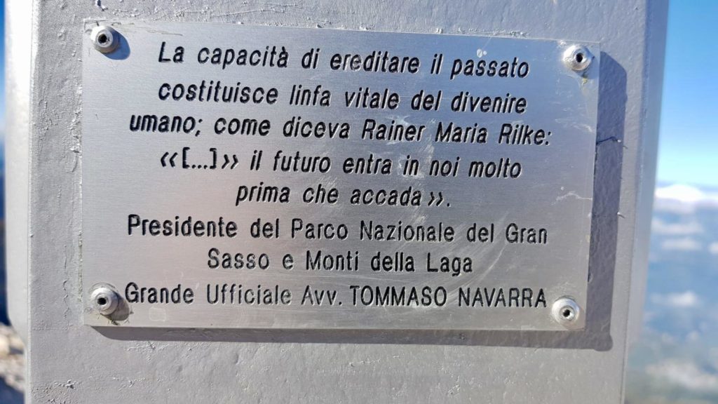 Alla scatola del libro di vetta è fissata una terza targa. Inizia con la frase “La capacità di ereditare il passato costituisce linfa vitale del divenire umano”. Prosegue citando Rainer Maria Rilke, scrittore e poeta austriaco vissuto tra il 1875 e il 1926, “il futuro entra in noi molto prima che accada”. Segue la firma. Presidente del Parco Nazionale del Gran Sasso e Monti della Laga, Grande Ufficiale Avv. TOMMASO NAVARRA. Il nome del presidente è maiuscolo, quello del letterato mitteleuropeo no.