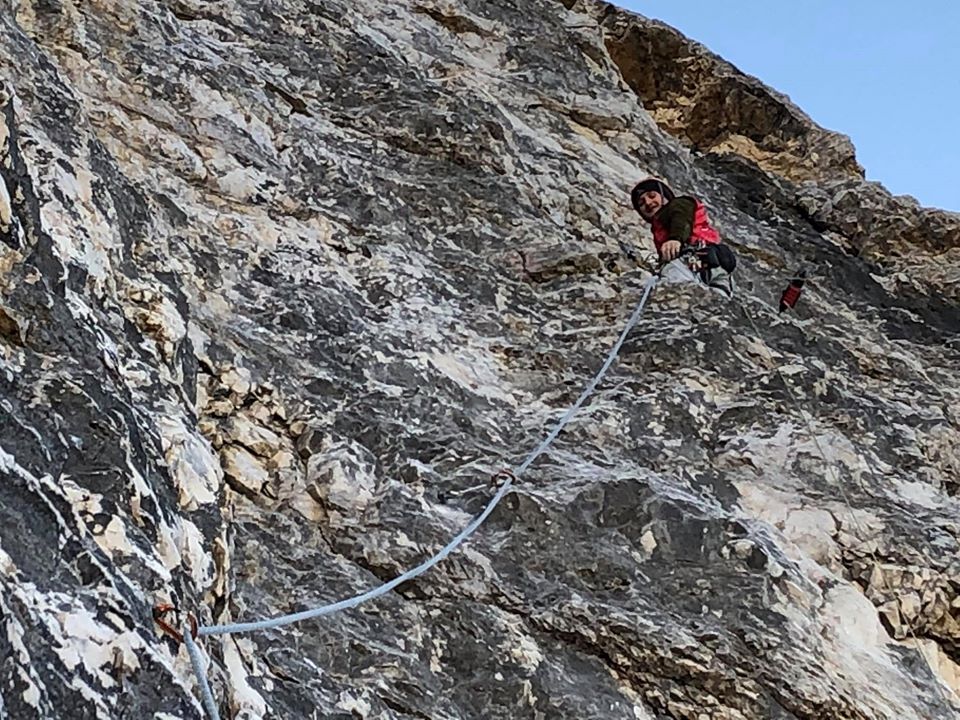 Così Martin ha deciso di tornare alla Cima Grande in ottobre, con Rišo Schwarcz come compagno di cordata. Non si aspettavano di trovare mezzo metro di neve fresca. I primi tiri sono sembrati terribili, nonostante ciò sono avanzati un po’ lungo la via, finché la finestra meteo ha consentito. Hanno così rimosso le corde fisse prima dell’inverno e sono tornati a casa.
