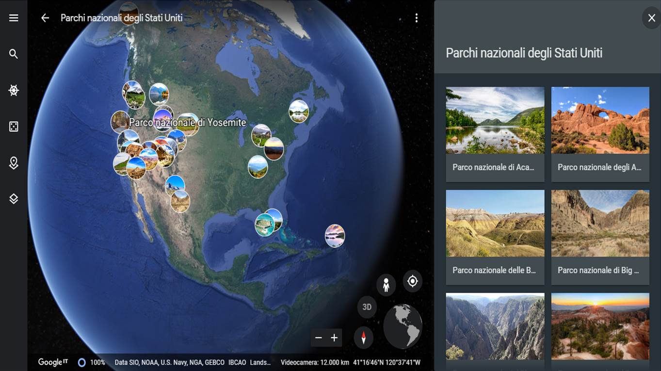 Con Google Earth è possibile fare un tour virtuale toccando 31 dei Parchi Nazionali statunitensi, tra cui Yosemite, Yellowstone, Grand Canyon, Mount Rainier, Denali, Joshua Tree, Death Valley. E ancora il Glacier National Park e il Parco Nazionale delle Montagne Rocciose. A partire dalla home di Google Earth basta cliccare sul simbolo di ricerca e inserire la dicitura “Parchi nazionali degli Stati Uniti”. Buon tour!