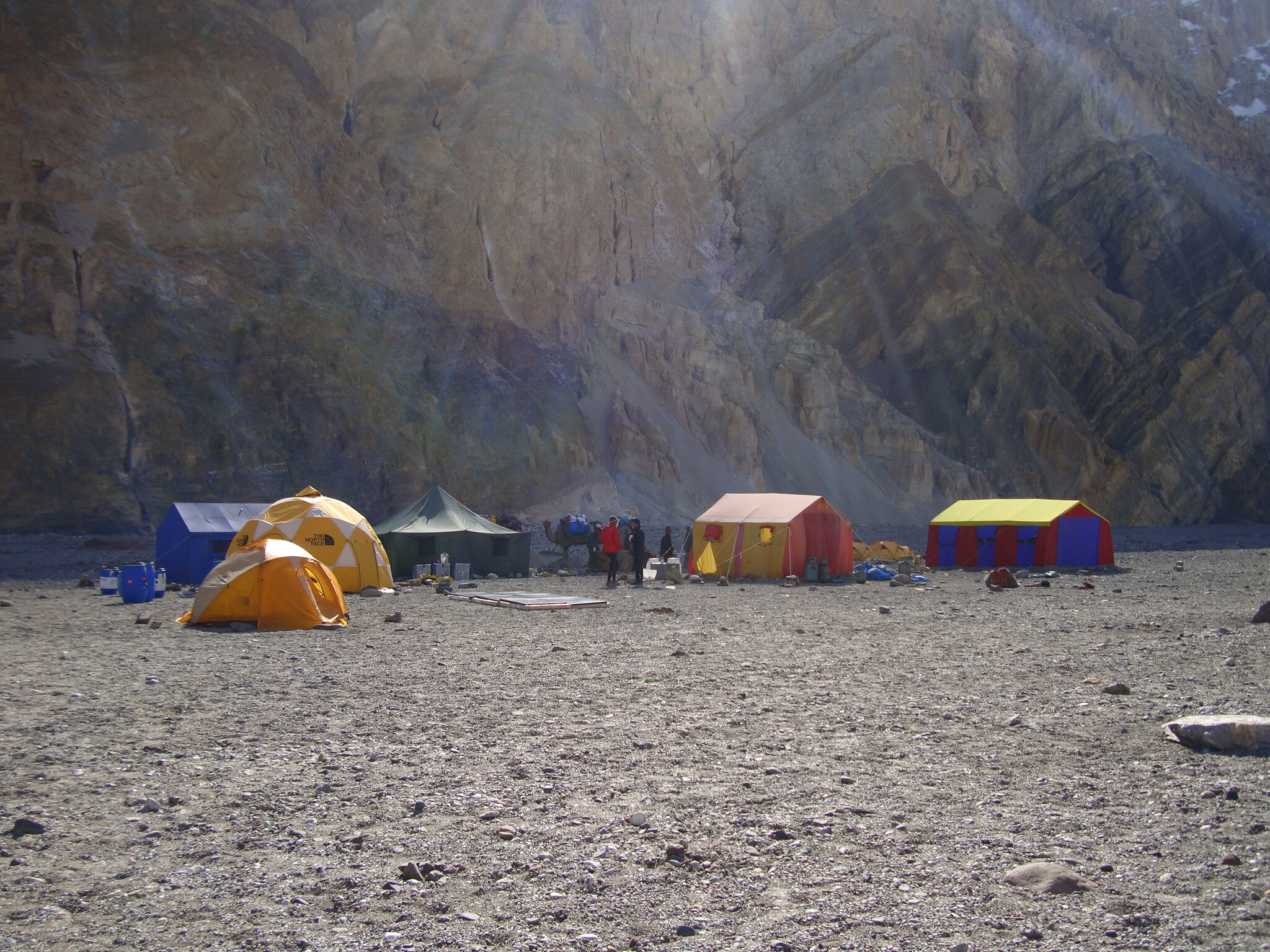 Ci fermammo alla Karka e poi di nuovo in fondo alla valle dell’Aghil River. L’acqua dei fiumi era potente e aveva cambiato in alcuni tratti il nostro percorso: alcune vallette laterali erano diventate torrenti difficili da guadare. Ci accampammo sul fondo della valle su un rialzo sotto il quale ruggiva il fiume. C’erano una ventina di cammelli: erano i nostri che stavano andando a prendere Mario, Hervé e Daniele. Sentii il Berni al telefono e lo rassicurai del fatto che la sera del giorno dopo avrebbero visto arrivare cammelli, asini, cani e kirghisi. Dal mattino successivo avrebbero iniziato a smontare e imballare tutto.