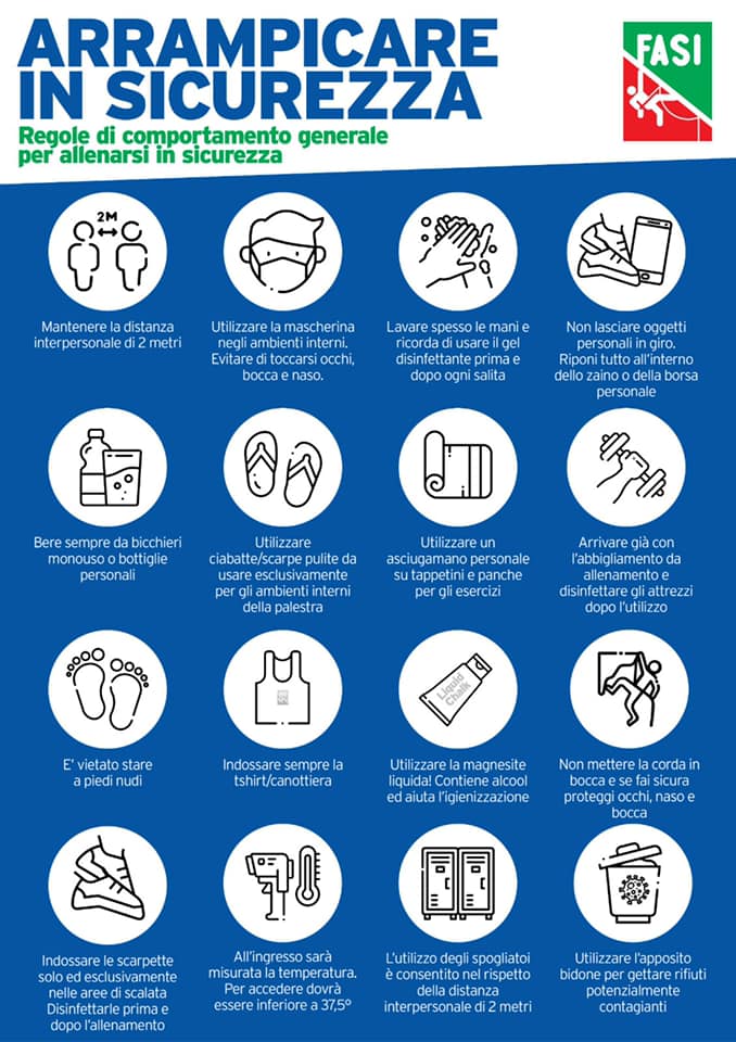 Il 25 maggio, data a partire dalla quale torneranno operativi sul territorio nazionale palestre e centri sportivi (verificate le eventuali deroghe della Regione in cui siete), anche gli appassionati di arrampicata potranno riprendere ad allenarsi indoor. Accanto alle Linee Guida stilate dal Ministero dello Sport, indicazioni che obbligatoriamente dovranno essere seguite al fine di tutelare la salute di quanti praticano l’attività sportiva e degli operatori all’interno delle palestre, la FASI (Federazione Arrampicata Sportiva Italiana) ha voluto fornire il proprio contributo, realizzando un cartellone contenente 16 consigli specifici per arrampicare in sicurezza indoor.