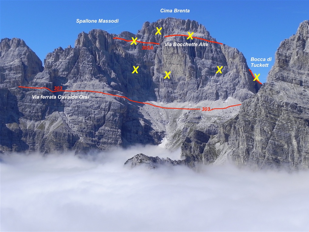 Per gli appassionati dei percorsi attrezzati si segnala che in alternativa, fra i rifugi Tuckett-Sella e il rifugio Alimonta, è possibile percorrere la via ferrata SOSAT (305B). La via ferrata Osvaldo Orsi (303) permette invece di collegare i rifugi Tuckett-Sella ai rifugi Tosa-Pedrotti. Sul versante del rifugio Alimonta, non appena le condizioni di innevamento lo permetteranno, sarà invece possibile percorrere la via ferrata Oliva Detassis (396) e il tratto delle Bocchette Alte fra la Bocchetta Bassa dei Massodi e la Vedretta degli Sfulmini.