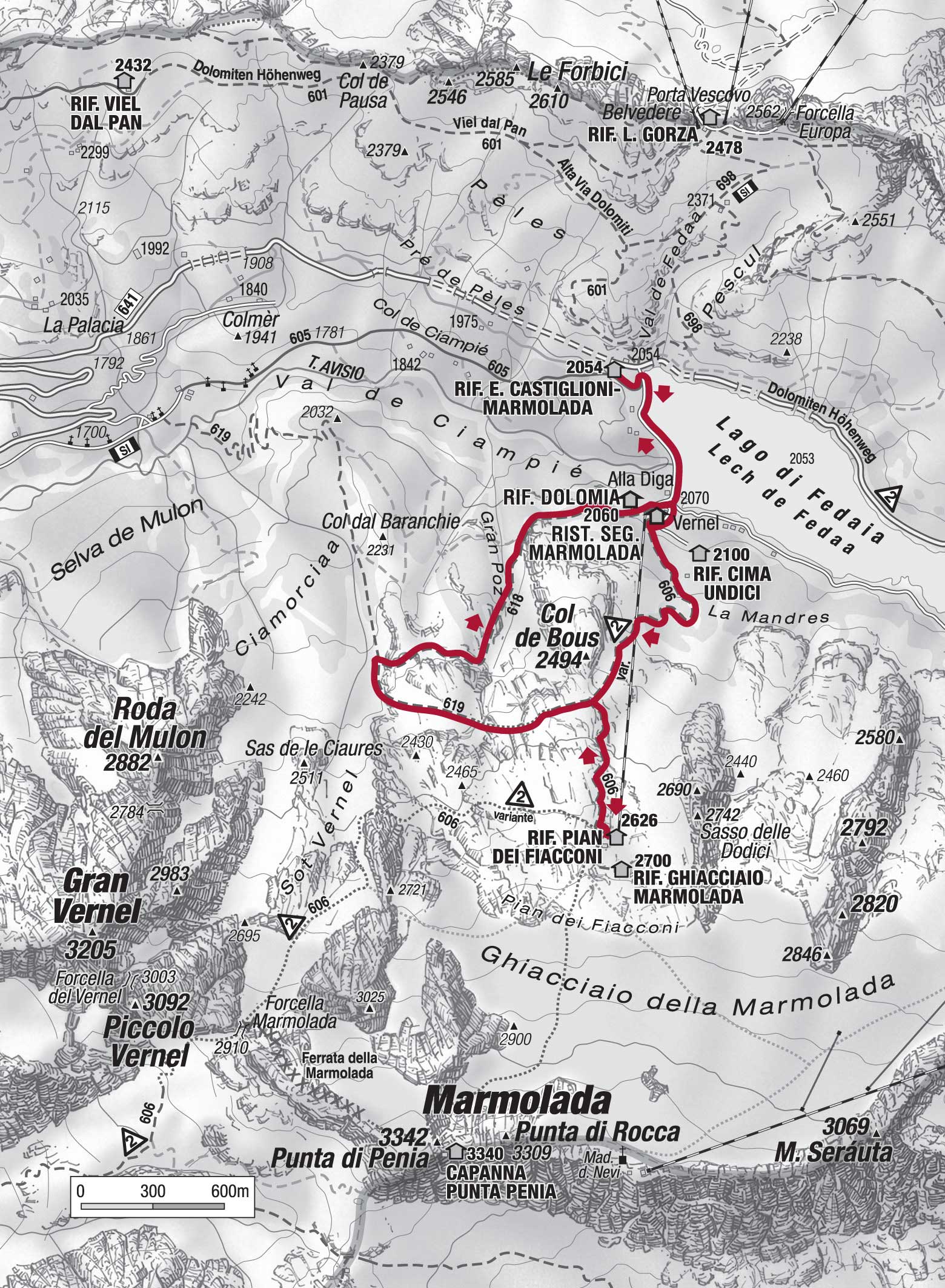 Il Ghiacciaio della Marmolada, un tempo imponente, oggi in forte ritiro, resta comunque uno dei poli attrattivi delle Dolomiti. Alla sua base sorge il rifugio Pian dei Fiacconi, raggiungibile con la bidonvia dal Lago di Fedaia. Proponiamo invece la salita a piedi, più faticosa ma remunerativa, con discesa per il Col de Bous, tra resti della Grande Guerra e interessanti emergenze geologiche e naturalistiche, lungo un percorso poco frequentato.
