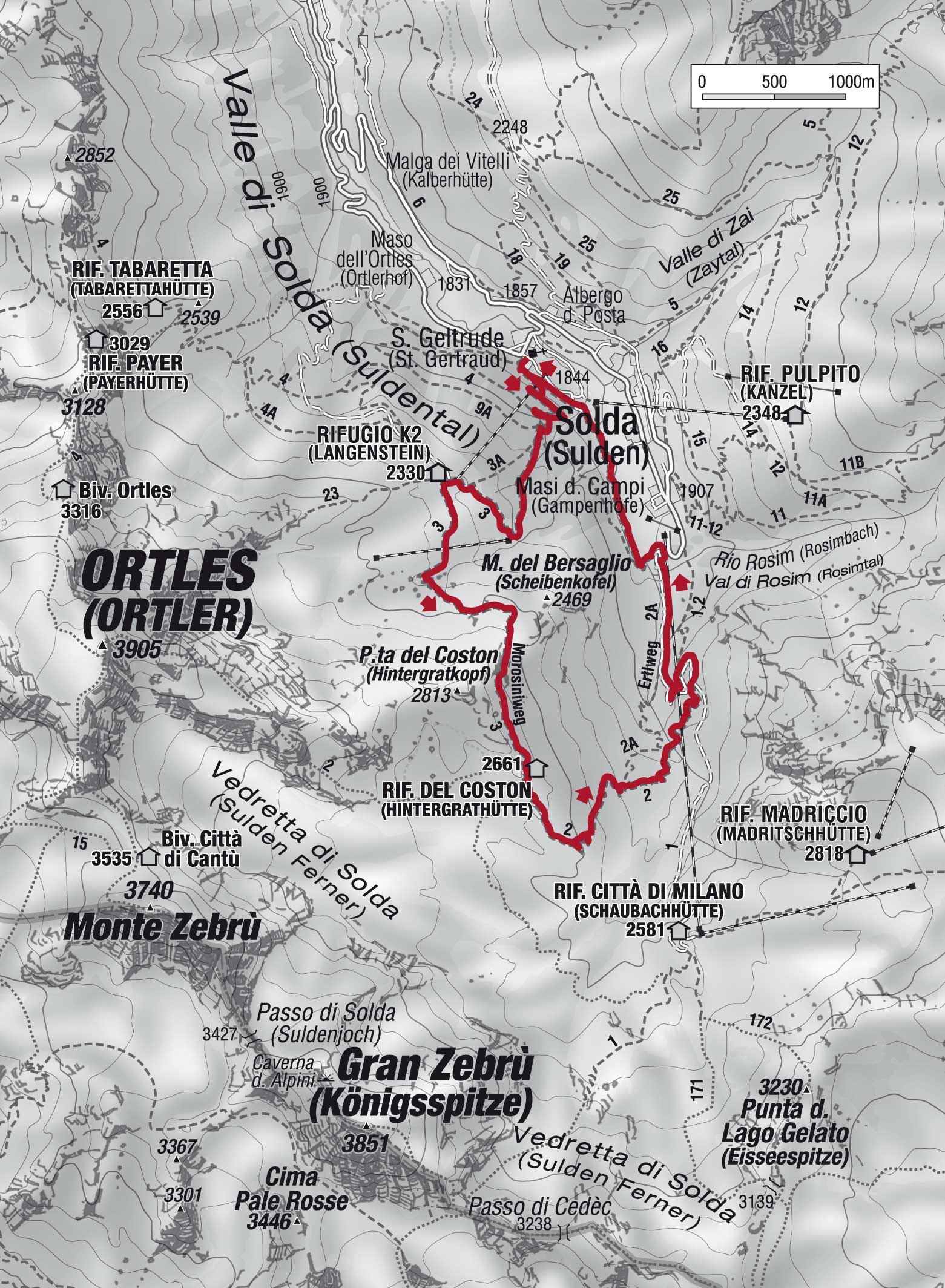 Il rifugio del Coston si trova in una posizione invidiabile proprio di fronte alla parete nord del Gran Zebrù e al tormentato mondo glaciale tra la Cima di Solda e l’Ortles. Si raggiunge da Solda con una bella e semplice escursione e permette di spingersi ai rifugi Payer e Borletti, mentre con un minimo di capacità alpinistiche sono possibili le entusiasmanti traversate in Valle di Cedec o in Val Zebrù.