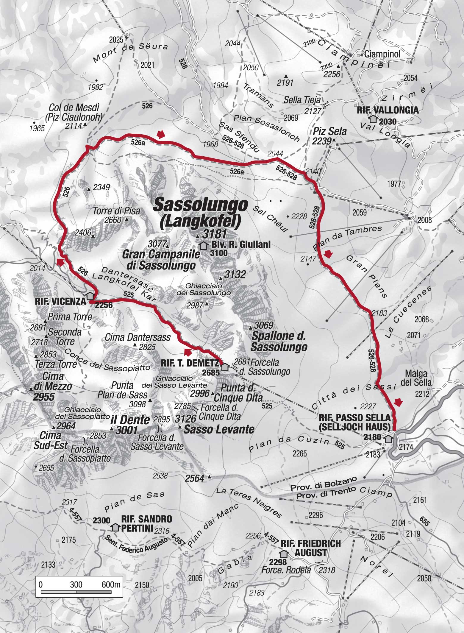 Arrivati al rifugio Vicenza (2256 m), si continua verso il basso sul sentiero n° 525, quindi al bivio si svolta a destra sul n° 526. Il sentiero, con diversi saliscendi, costeggia alla base il versante settentrionale del Sassolungo, e con ampio giro orario, ignorando le deviazioni e in ultimo su pascoli, torna agevolmente al Passo Sella.