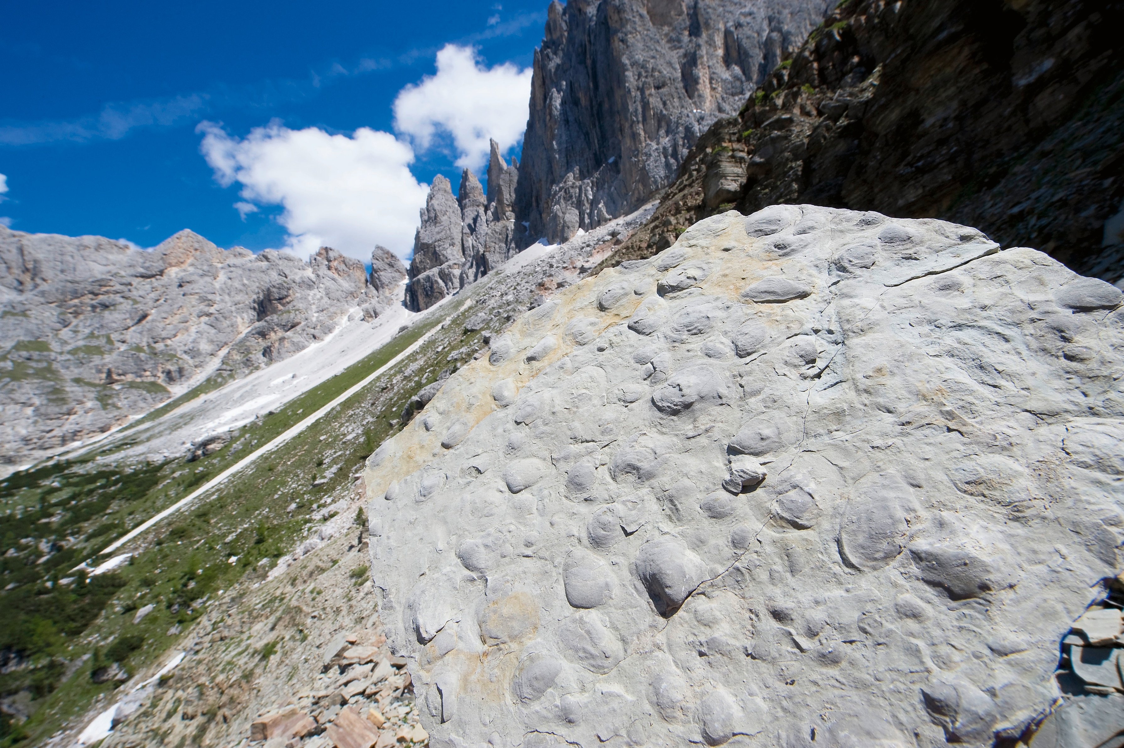 Quel che successe milioni di anni dopo, con la collisione fra la placca africana e quella euroasiatica che fece sollevare le Alpi e, quindi, anche le Dolomiti, è tutta un’altra storia. “Restando all’interno delle suggestioni che abbiamo evocato fin qui, oggi le Dolomiti portano i segni delle fasi dell’evoluzione terrestre, dai vari strati geologici della gola del Bletterbach, integri e visibili esattamente come si sono depositati presso l’attuale località di Aldino fin dai tempi del ‘Lago Eyre’, alle impronte dei primi dinosauri incise sulla sabkha, ora diventata roccia, alle pendici del Monte Pelmetto, in Val di Zoldo, e dei Monti del Sole, in Val Pegolera” racconta Preto. Andar per fossili con lui è come seguire un esperto cercatore di funghi. Perché conosce i “posti” dove scovarli, nascosti lì da milioni di anni. I bivalvi souvenir del periodo “Jesolo” al Passo Valles o al Passo Rolle; i sedimenti lasciati dal mare profondo al tempo delle “Maldive”, come le ammoniti e le conchiglie del Latemar o del Monte Cernera (a sud della Forcella Giau); le piante, le ammoniti e i bivalvi estinti come la daonella deposti al Piz del Corvo e al Mondeval quando i Monti Pallidi erano le “Hawaii”; l’ambra derivata dalla resina fossilizzata delle conifere all’epoca delle “Everglades”, ora visibile nell’area del Rifugio Dibona e nel bacino di Cortina d’Ampezzo; e infine il mollusco del genere Megalodon, una sorta di ostricone del fango che del suo passaggio sulla Terra 200 milioni di anni fa ha lasciato, sul Pelmetto e alle Tre Cime di Lavaredo, l’impronta di un cuore.