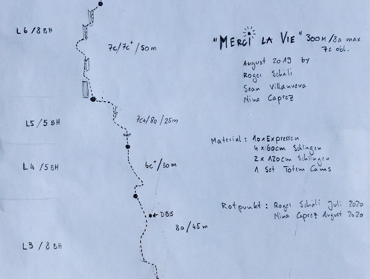 “Ho iniziato ad attrezzare questa via 10 anni fa – ricorda Schaeli – . Lo scorso anno con i miei amici super motivati Nina e Sean siamo stati in grado di creare questi 8 grandiosi ed impegnativi tiri, frutto di un lavoro di squadra. Nelle scorse settimane ho lavorato sulla via qualche giorno e sono riuscito a portare a termine la salita in meno tempo del previsto”.