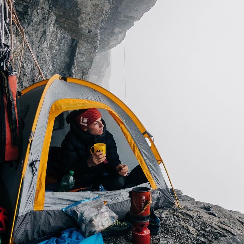 “Dopo un inizio di primissima mattina – racconta la Zangerl – ci siamo trovati letteralmente a combattere per superare una zona molto umida della parete. In totale c’erano 4 tiri umidi tra un 6c+ e un 7c. Arrampicare un 7c carico di umidità risulta estremamente difficile e insicuro. C’è voluto parecchio tempo, fortuna e tanta motivazione per raggiungere il secondo bivacco dei cechi, ma alla fine eravamo perfettamente in orario. Nella parte superiore della parete abbiamo trovato condizioni perfette e siamo stati decisamente veloci, raggiungendo il passaggio chiave alle 6 del pomeriggio. Il tempo sembrava ancora bello. C’erano ancora 4 tiri facili da affrontare prima di raggiungere la vetta entro le 24 ore. Eravamo a 16 ore dalla partenza, non ero mai caduta e l’umore era alto. Avevamo abbastanza tempo secondo i calcoli. Due tiri più tardi una enorme tempesta ci ha investiti. Ha iniziato a grandinare e buttare giù pioggia a più non posso, e io ero nel bel mezzo del penultimo tiro. Ero completamente fradicia, senza possibilità di raggiungere la sosta successiva o scendere. Non ci sono protezioni fisse infatti sul tiro. Ho dovuto improvvisare e ho trovato buona come soluzione tornare da Jacopo. In tale situazione abbiamo saputo lavorare perfettamente come squadra, grazie alle tante avventure vissute insieme. Le temperature si sono abbassate tremendamente e l’acqua si è trasformata in ghiaccio. Abbiamo affrontato la discesa di 31 tiri sotto una cascata d’acqua. Quando abbiamo raggiunto il bivacco e i nostri tiepidi sacchi a pelo alle 10 di sera non avremmo potuto sentirci più felici“.