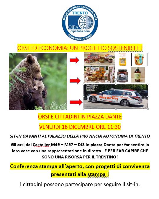 Venerdì 18 dicembre 2020 alle ore 11:30 l’Oipa scenderà in piazza a Trento, chiamando a raccolta gli animalisti per un sit-in sotto il palazzo della Provincia (Piazza Dante). Il sit-in sarà finalizzato a chiedere la libertà non solo per M57 ma anche per M49 e DJ3. Libertà che il Presidente della PAT Fugatti continua a negare loro.