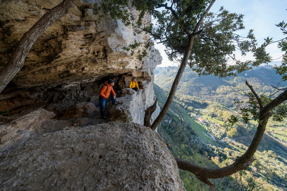 Proprio così, provare per credere. E ci hanno provato, e creduto, i primi alpinisti (appena dei ragazzi) che sul finire degli anni Sessanta avevano scoperto dell’esistenza delle falesie, e si erano armati di machete, prima ancora che di corde e chiodi, per aprirsi un varco nella fittissima macchia mediterranea e arrivare ai piedi delle pareti. Ho chiesto di raccontare le loro vicende a uno storico illustre dell’alpinismo, Enrico Camanni: “Per tutti gli anni Settanta la saga dell’arrampicata finalese ha avuto un sapore pionieristico; le rocce dell’altipiano erano terra d’avventura geografica, oltre che alpinistica, e nonostante la vicinanza all’Aurelia e agli stabilimenti balneari, sembrava di esplorare un pezzo di Amazzonia nel cuore della modernità. Ovunque, camminando e scalando, s’incontravano i segni di vecchie civiltà, con tanto di coppelle, croci primitive, grotte, spelonche, altari e villaggi rupestri sommersi dalla macchia, ma per gli arrampicatori la pietra del Finale era una continua pazzesca sorpresa, e la domanda era sempre la stessa: «Come diavolo abbiamo fatto a non accorgercene prima?» Se n’erano accorti i popoli preistorici e i popoli contadini, ma non quello degli alpinisti. Sì, perché la roccia è ovunque sull’altipiano, il calcare fa parte del paesaggio… Finale è le sue falesie. Era ovvio che prima o poi gli scalatori andassero a mettere il naso. La data era scritta: maggio 1968! Proprio nel mese cruciale della contestazione, un gruppetto di arrampicatori genovesi inventa la prima via sul siluro di Rocca di Corno: la Titomanlio, dal cognome del primo salitore. Roberto sale con i terribili fratelli Eugenio e Gian Luigi Vaccari, che in cima esclamano entusiasti: «Ma qui c’è da arrampicare per una vita!»”
