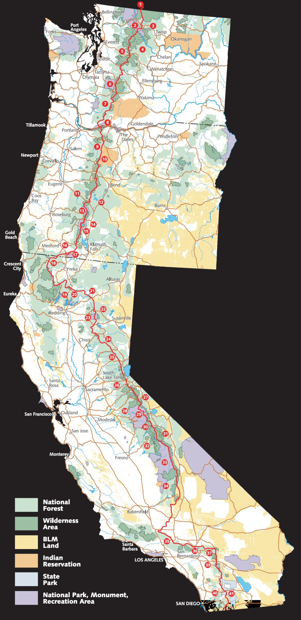 Il Pacific Crest Trail (Sentiero delle creste del Pacifico) ha il capolinea meridionale nel confine tra USA e Messico (vicino a San Diego) e quello settentrionale in quello tra USA e Canada, nel Parco Manning della Columbia Britannica. Insieme al Sentiero degli Appalachi e al Continental Divide Trail, il Pacific Crest Trail è stato tra i primi tre sentieri a lunga distanza degli Stati Uniti; il loro percorso completo, una lunga e dura camminata di mesi, è noto come la Tripla corona dell’escursionismo (Triple Crown of Hiking): gli escursionisti che lo completano sono chiamati Thru-Hikers.