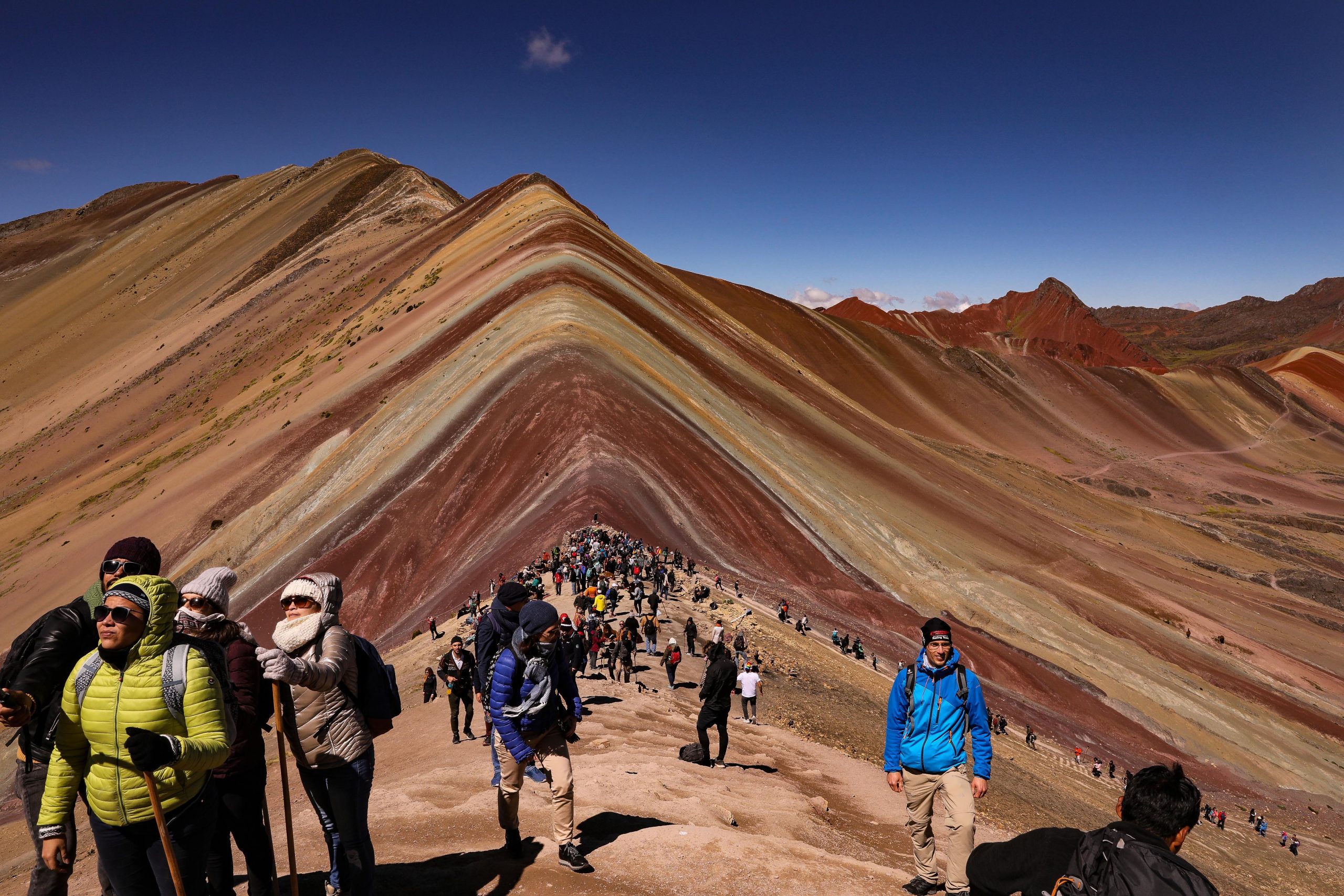 Iniziamo la nostra esplorazione dal classico Monte Arcobaleno, emblema delle montagne policromatiche. Ci troviamo sulle Ande, in Perù, nella regione di Cusco. La vetta, alta 5200 m, è nota in lingua locale come Vinicunca, ovvero la “Montagna dei Sette Colori“. Sui pendii si mescolano molteplici sfumature di colore, dall’ocra all’arancio, dal verde all’azzurro, al giallo, rosa e viola, legate alla presenza di minerali ricchi in ferro, zolfo e rame.
