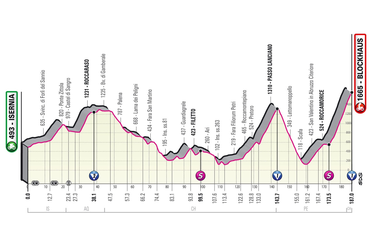 Dalla Sicilia si passa al Molise per la prima vera tappa di montagna, tra salite e discese appenniniche. 187 chilometri da Isernia a cima Blockhaus, dove le pendenze sono a doppia cifra. Prima un continuo saliscendi che porta a Roccaraso, quindi a Guardiagrele. Dopo inizia la doppia scalata al Blockhaus. Su fino a Passo Lanciano, poi giù a perdere tutta la quota e di nuovo su, contornando il massiccio della Majella e sfidando pendenze proibitive.