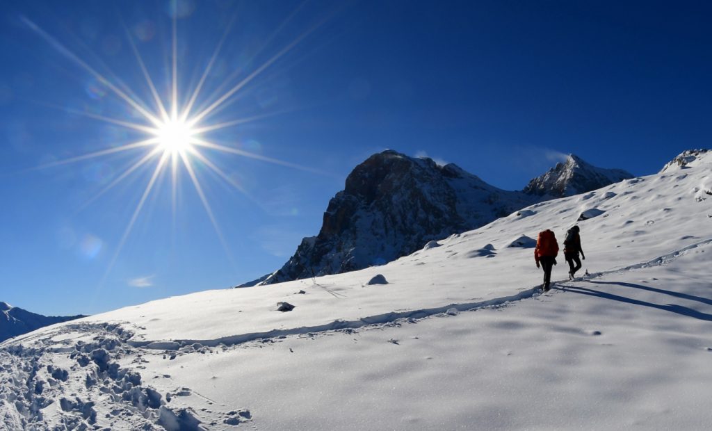 Una strada innevata sale dai Prati di Tivo al Piano del Laghetto e alla croce dell’Arapietra, di fronte a un incredibile panorama dei due Corni. Si può proseguire con un tratto più ripido verso il ben visibile Albergo diruto, il rifugio Cima Alta offre una piacevole sosta. Dal piazzale dei Prati (1450 m) si segue la strada che inizia accanto al Parco avventura e sale dolcemente nella faggeta. Si superano un fontanile e due tornanti, si lascia a destra la deviazione per il rifugio Cima Alta e si sbuca sul Piano del Laghetto, in vista del Corno Grande e del Corno Piccolo. In breve si sale alla panoramica croce (1683 m, 1.30 ore) che può essere la meta della camminata. Traversato un pianoro si raggiunge il crinale dell’Arapietra e lo si risale sulla destra fino all’Albergo diruto (1896 m, 0.45 ore). Si ridiscende per la cresta, si piega a sinistra e si raggiunge il rifugio Cima Alta (1620 m). Ritrovata la strada, la si segue fino ai Prati. Occorrono 1 ora dalla croce, e 1.30 ore dall’Albergo diruto.