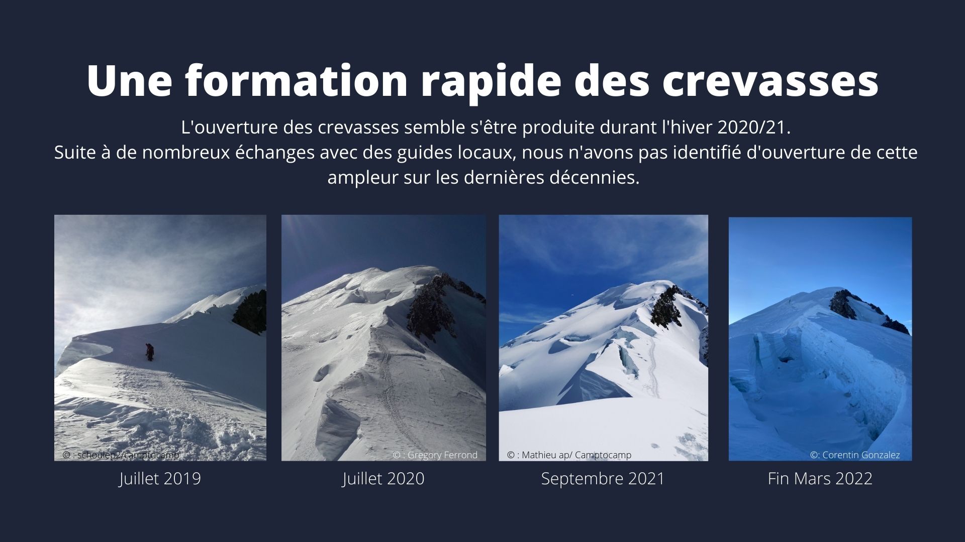 A dirlo uno studio condotto da Xavier Cailhol, Jacques Mourey, Ludovic Ravanel che nel marzo 2022 sono saliti a verificare le condizioni della montagna e a compiere alcune misurazioni e rilevazioni topografiche con GPS e droni allo scopo di creare un modello 3D per comprendere come si potrebbe evolvere la situazione del ghiaccio. Come spiega Montagnes Magazine, che riporta per primo la notizia, l’apertura di questi crepacci non è nuova e sembra essere avvenuta durante l’inverno 2020/21, tanto che la via seguita dalle ascese della scorsa estate passava sul fondo di una di queste fessure riempita dalla neve sotto l’azione del vento. Cosa che, spiegano gli studiosi, potrebbe avvenire anche durante la prossima stagione di vette, ma è presto per dirlo. Tra i pericoli oggettivi rilevati anche numerosi ponti di neve e la pendenza nella zona crepacciata che raggiunge i 50° su ghiaccio vivo. “Nelle condizioni attuali questo settore rende l’ascensione del Monte Bianco più difficile tecnicamente e richiede una grande prudenza nell’attraversamento dei ponti di neve”.