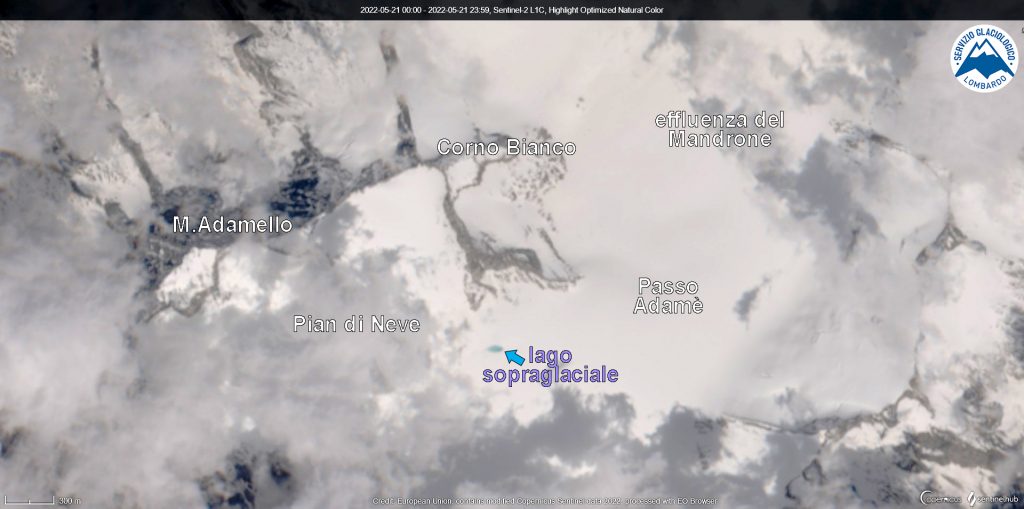 “Domenica 22 maggio – prosegue il post – gli operatori Amerigo Lendvai e Andrea Scaltriti hanno documentato la formazione di uno di questi laghi a 3140 m fra la zona del Pian di Neve e l’effluenza del Mandrone. Probabilmente a causa della rapidità della fusione data dalle eccezionali temperature in quota, lo specchio d’acqua è un po più grande del solito con una lunghezza superiore ai 100 m ed è visibile anche dalle immagini satellitari Sentinel-2.”
