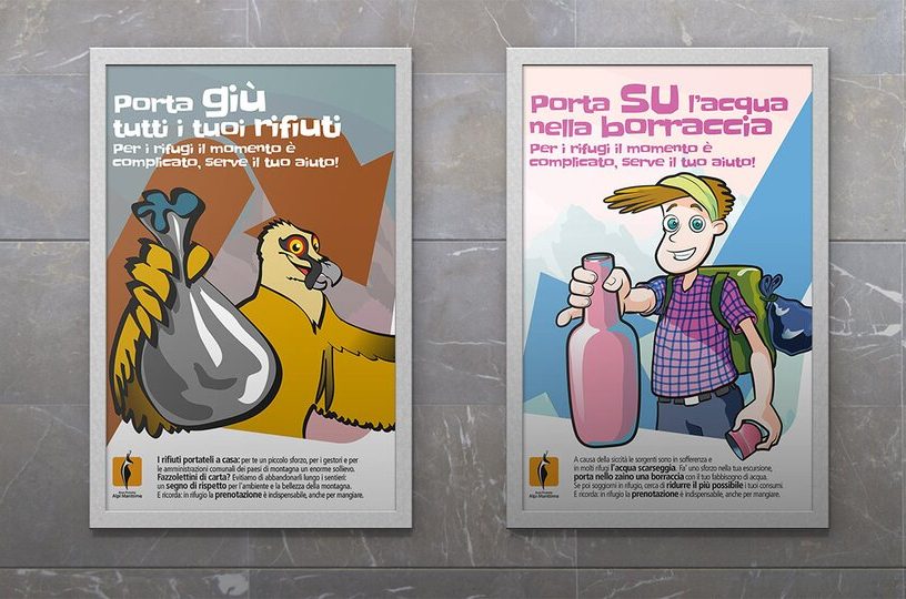 Sono due i manifesti che caratterizzano la campagna, che verranno posizionati in tutti i punti di attestazione veicolare. Il primo è Porta SU l’acqua nella borraccia, con cui si invitano gli escursionisti a essere il più possibile autonomi rispetto al fabbisogno d’acqua, in modo da intaccare il meno possibile la dotazione dei rifugi. Ma il messaggio vuole essere più generale: in caso di permanenza in quota è necessario ridurre il più possibile i propri consumi e accettare di buon grado le limitazioni, tra cui in prospettiva potrebbe essere ricompresa anche l’impossibilità di farsi la doccia. L’utilizzo della borraccia – ma virtuosa è anche la scelta di servirsi di una bottiglia in plastica da portare con sé in più momenti successivi – ha anche una ricaduta positiva sul contenimento della produzione di rifiuti.