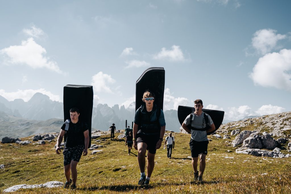 Il giorno precedente, il 2, è stato effettuato un sopralluogo con i videografi, per poi portare lì il pianoforte, salire al Rifugio Bolzano con la teleferica e raggiungere il punto stabilito, che si affaccia su Siusi. Per questa impresa sono servite sei persone – ci sono cinque sacche, ma serve il sesto per alternarsi. Sono saliti Andrea, suo padre Umberto, suo zio Michele, i cugini Jonas, Elias e Gabriel per trasportare il pianoforte, più i due videomaker, il fotografo e Ugo, il falegname, per le eventuali piccole riparazioni. Ci vuole circa un’ora e mezzo-due di cammino, Andrea e il padre Umberto hanno creato un sentiero apposta, segnato, per evitare certi dislivelli e certe rocce che sarebbero stati più complicati da superare. Si monta il pianoforte per le riprese al tramonto – lo Sciliar si affaccia a ovest, quindi dal punto di vista del sole sono le ore migliori – e, una volta finito, si smonta tutto e si scende con i frontalini al rifugio.