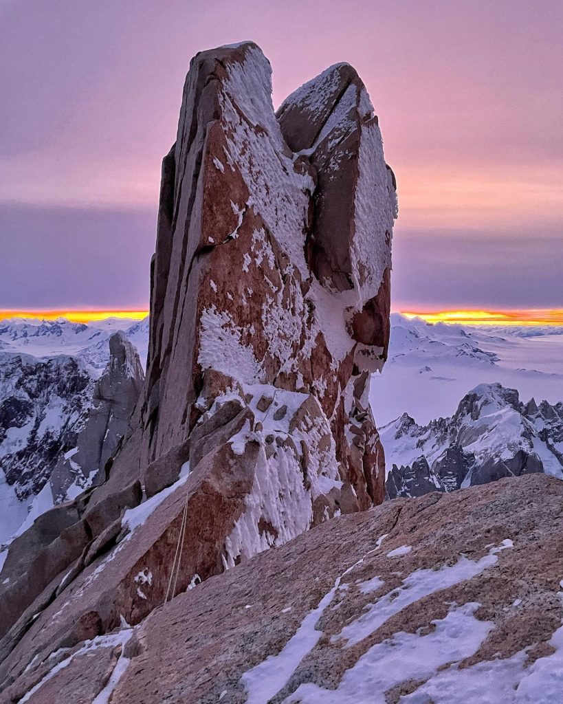Alle 20 circa è fuori dalla sezione più difficile, ma non è finita. “Essere da solo sotto la cima del Fitz Roy, in inverno, al buio, è una sensazione assurda” confessa. Le cose però vanno meglio: “La salita è stata abbastanza facile, ma ha aumentato la tensione sapendo che avrei dovuto scendere su ghiaccio duro durante la discesa. Ho raggiunto la cima del Fitz Roy alle 21:23 e ho potuto vedere le luci di El Chaltén 3000 metri più in basso. Mi sono chiesto se qualcuno in città fosse fuori a prendere un po’ d’aria fresca e potesse vedere la mia lampada frontale a 3000 metri di altezza. Per tutto il giorno ero stato estremamente fortunato ad avere un vento quasi nullo, ma alla fine, sulla vetta, c’era una leggera brezza da nord. Mi sentivo estremamente ansioso per la discesa e ho iniziato a scendere solo un paio di minuti dopo essere arrivato in cima”.