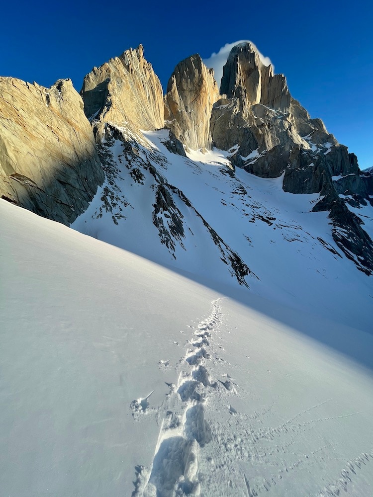 La mattina del 17 lo statunitense è già in direzione del Fitz Roy, che comincia a scalare il 19 mattina, nonostante le gambe stanche dall’avvicinamento nella neve profonda. “Sui 1000 metri di canalone inferiore fino al Bloque Empotrado le condizioni erano più o meno equivalenti a quelle precedenti” racconta Haley, che alle raggiunge il punto più alto toccato in precedenza. “Pur sentendomi ancora piuttosto intimidito, mi sentivo molto più sicuro di me rispetto al tentativo precedente. Inoltre, le previsioni indicavano che l’intera notte sarebbe stata tranquilla e potevo permettermi un ritmo lento. In questo tratto, inoltre, le condizioni erano più asciutte rispetto al passato, con un bel po’ di roccia nuda, e questo è stato sicuramente d’aiuto” racconta.