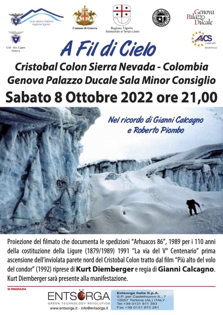 Sabato a partire dalle 21, nella sala del Minor Consiglio del Palazzo Ducale di Genova, si terrà una serata aperta al pubblico, con la proiezione del proiezione del film che documenta la prima ascensione della “Via del V centenario” sull’inviolata parete Nord del Pic Cristobal Colon (5.775 m), di cui Calcagno fu protagonista proprio in cordata con il giovane Roberto Piombo e Marcello Giovale. All’incontro prenderà parte anche Kurt Diemberger, compagno di Calcagno in molte spedizioni e autore delle straordinarie riprese effettuate durante la salita del Cristobal Colon.