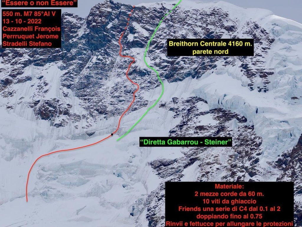 La via, che è stata chiamata “Essere o non Essere”, sale sulla parete nord per 550 metri alla sinistra della Gabarrou-Steiner e ha difficoltà M7 – 85* – AI V.