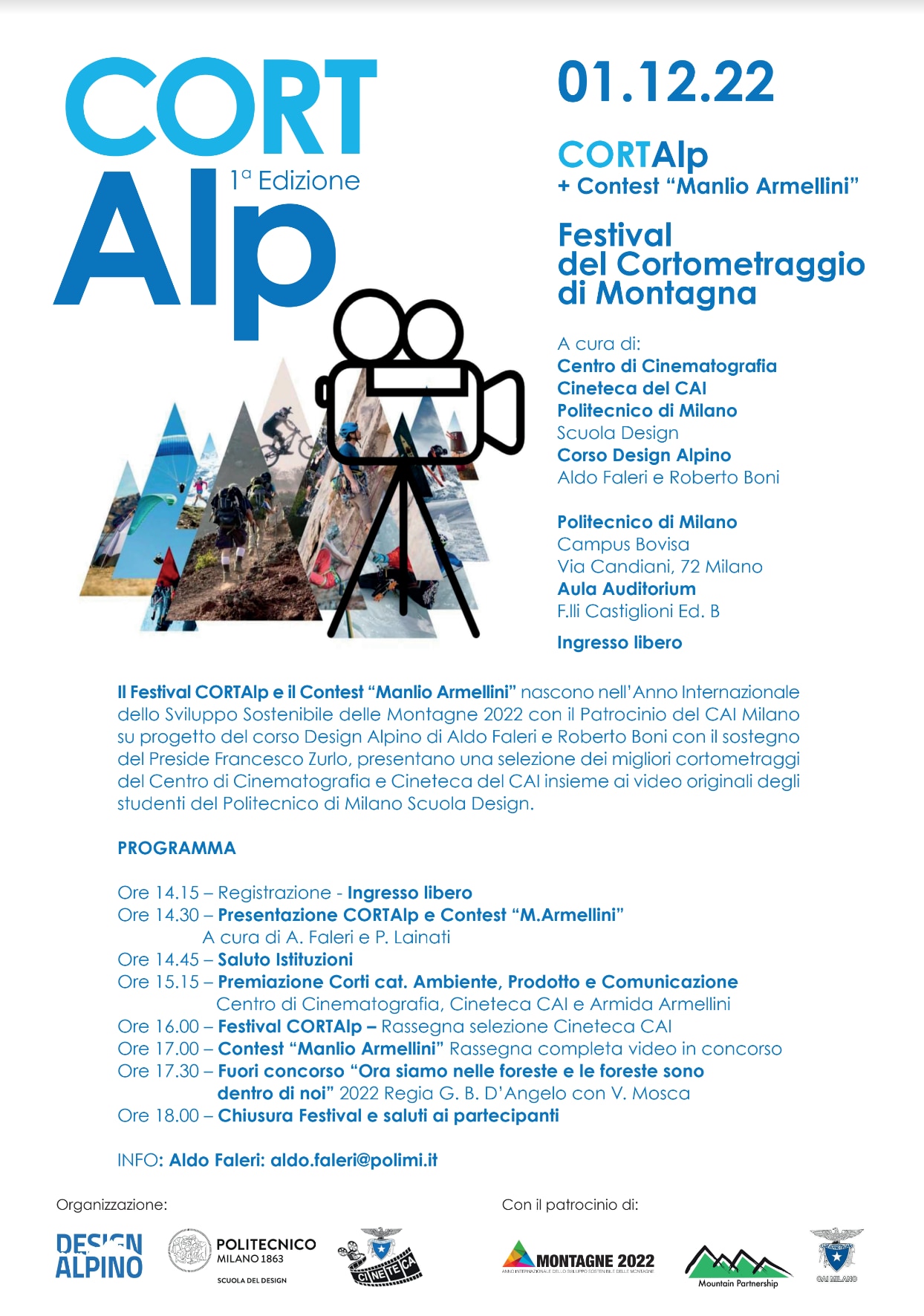 In occasione dell’Anno della Montagna Sostenibile 2022, dalla collaborazione del Centro di Cinematografia e Cineteca del Cai con il Politecnico di Milano – Scuola Design del corso Design Alpino di Aldo Faleri con Roberto Boni e il sostegno del Preside Francesco Zurlo, nasce la prima edizione del Festival del Cortometraggio di Montagna CORTALP e del contest “Manlio Armellini”, rivolto agli studenti del Politecnico di Milano e intitolato allo storico patron del Salone del Mobile e grande appassionato di montagna.