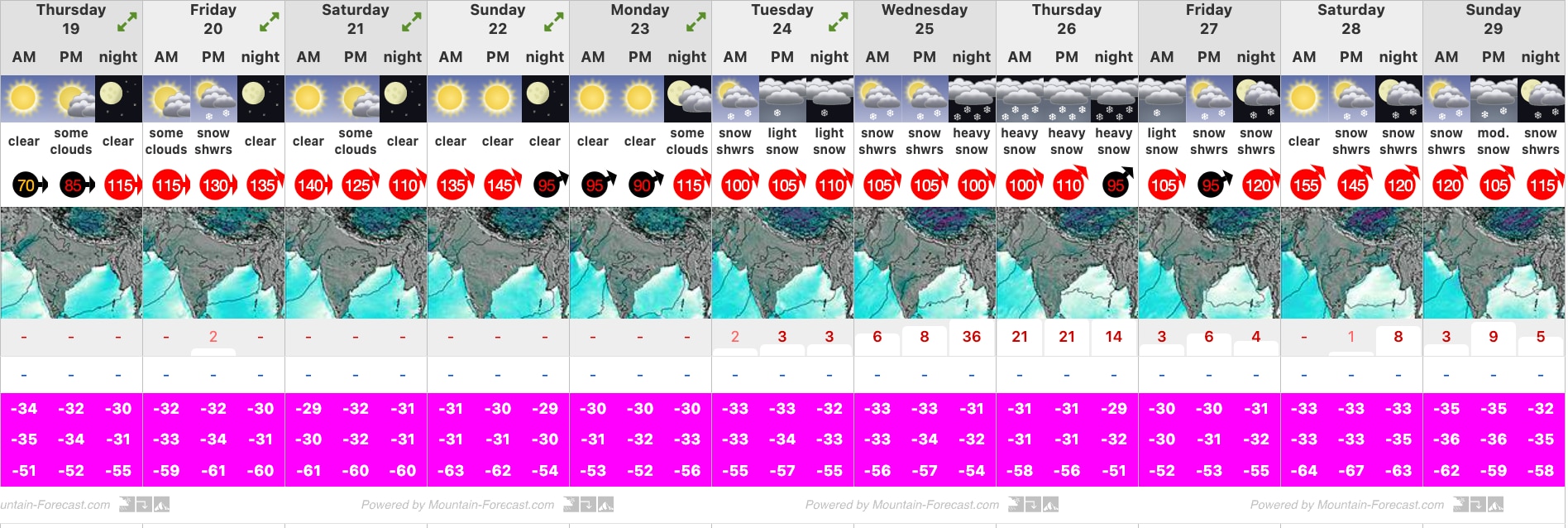 Il problema al momento è proprio quel “quando torneremo”. I due si sono dati come tempo massimo fine mese e al momento le previsioni fino al 28 gennaio annunciano venti quasi sempre oltre i 100 km/h con punte fino a 150 km/h. Impossibile a queste condizioni anche solo lasciare il campo base. L’unica speranza è che nei prossimi giorni le cose possano cambiare