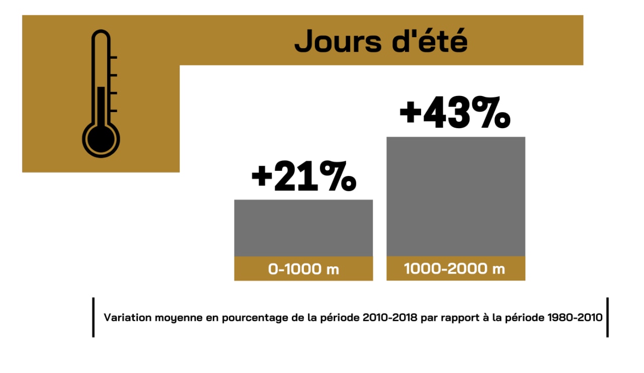 Un altro indicatore utilizzato per sondare la salute del massiccio del Monte Bianco è quello dei “giorni d’estate“, ovvero il numero di giorni durante l’anno in cui la temperatura massima è stata superiore ai 25°C. Il periodo di riferimento è quello che va dal 1981 al 2022 e risultati sono abbastanza evidenti: nell’ultimo decennio il numero di giornate calde è fortemente aumentato, soprattutto nella fascia altitudinale media tra 1000 e 2000 m.