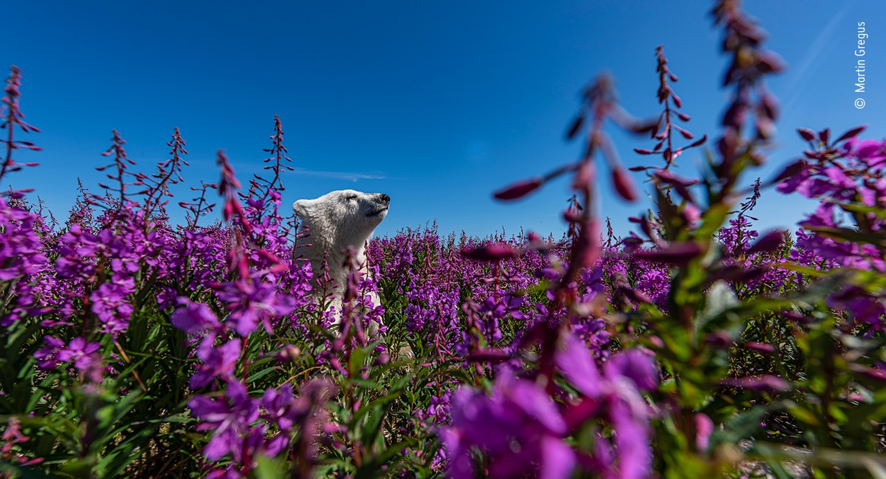- “Among the flowers” di Martin Gregus mostra un cucciolo di orso polare che gioca in un campo fiorito sulla costa della Hudson Bay, Canada. Realizzare lo scatto è stata una bella impresa, che ha previsto il posizionamento della fotocamera a livello del terreno, tra l’erba, e una paziente attesa a distanza per poi scattare da remoto, sperando di aver colto l’attimo.