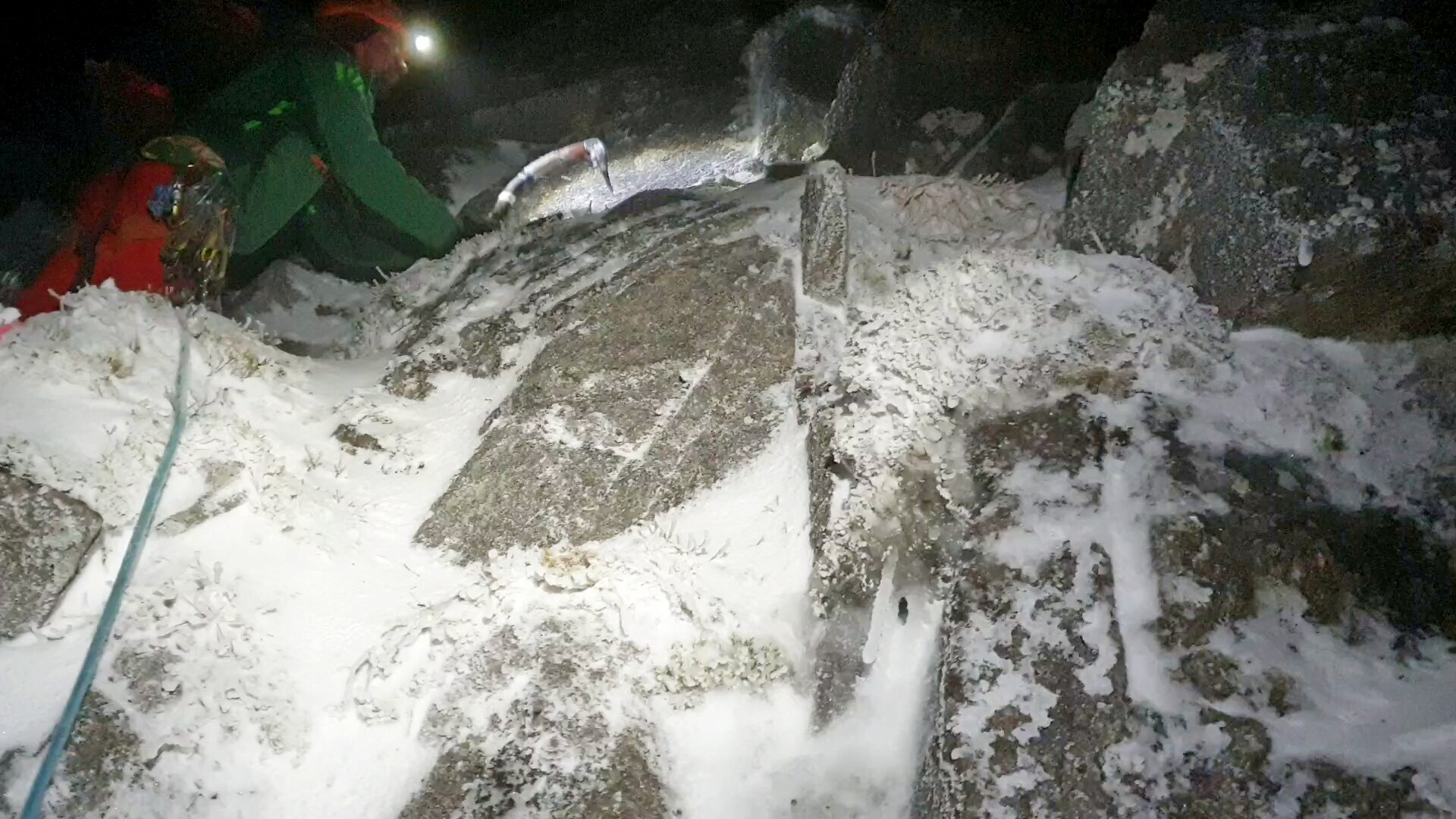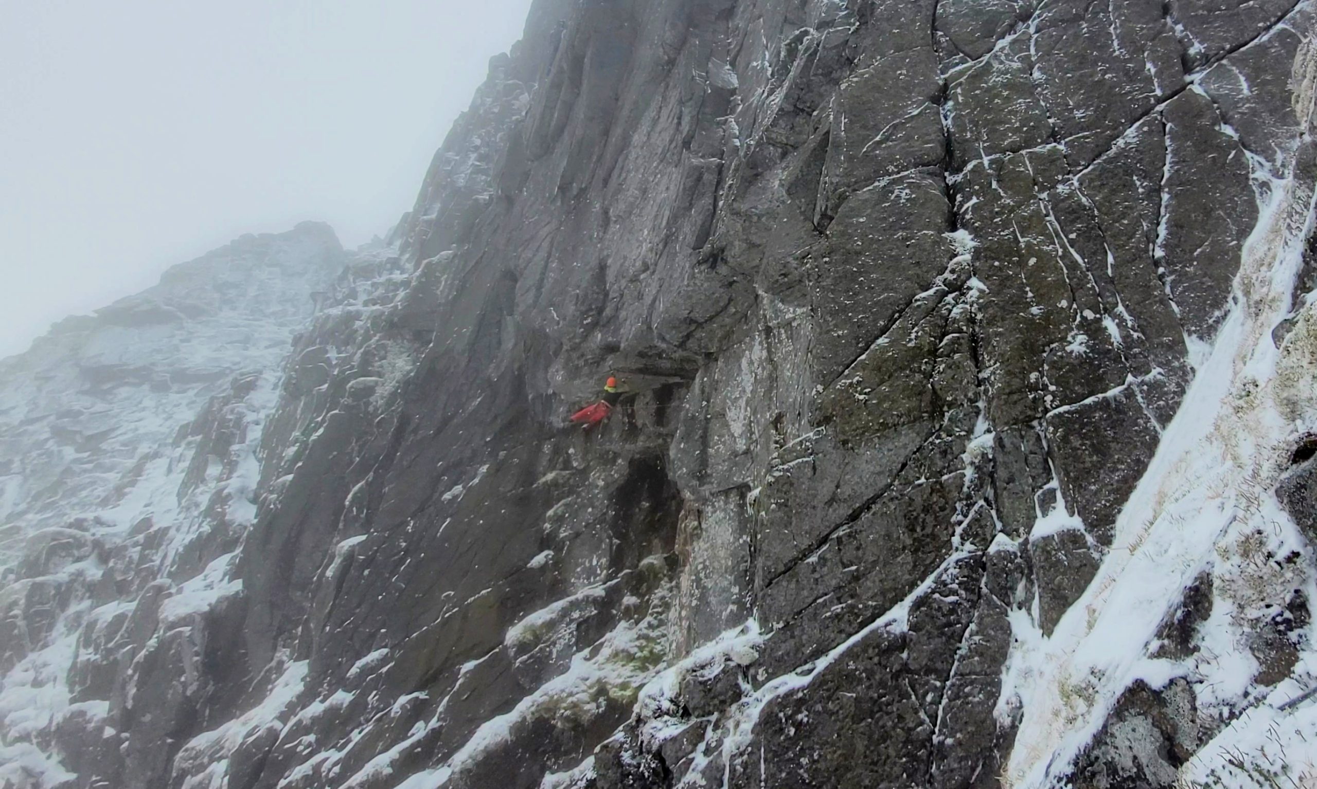 “Come si può vedere dalla foto panoramica di Lochnagar – aggiunge – , tutte le pareti erano innevate, soltanto la headwall di Shadow Buttress era nera vista la sua pendenza. Stessa cosa per le foto scattate nella parte alta della via, da cui si possono notare le condizioni invernali con neve abbondante, le zolle ghiacciate e la brina sulla roccia. Nel tiro chiave (strapiombante) erano presenti sia i ghiaccioli, sia il ghiaccio nelle fessure e questo aveva delle conseguenze non trascurabili per l’impegno della salita. Infatti nella fessura ghiacciata sotto il tetto sono riuscito a piazzare soltanto uno dei due friends che Greg aveva usato per proteggere il passo chiave. Sono stato appeso a lungo sotto il tetto su una picozza, cercando con la seconda di pulire la fessura dal ghiaccio, ma la fessura era inutilizzabile. Sono andato avanti con un solo friend in questa fessura che comunque è uscito fuori appena la corda è andata in tiro quando Dawid è partito dalla cengia. Quindi nel passo chiave ero praticamente sprotetto con rischio di un grande volo che sarebbe finito sulla placca sottostante. Anche in cima del tiro non potevo piazzare il friend per via del ghiaccio e ho fatto un grosso runout fino in sosta. Aggiungiamo infine un vento fortissimo e una tempesta di neve in corso”. Decisamente non c’è dubbio, come evidenzia Filip, sul riconoscerla come salita realizzata in condizioni invernali.