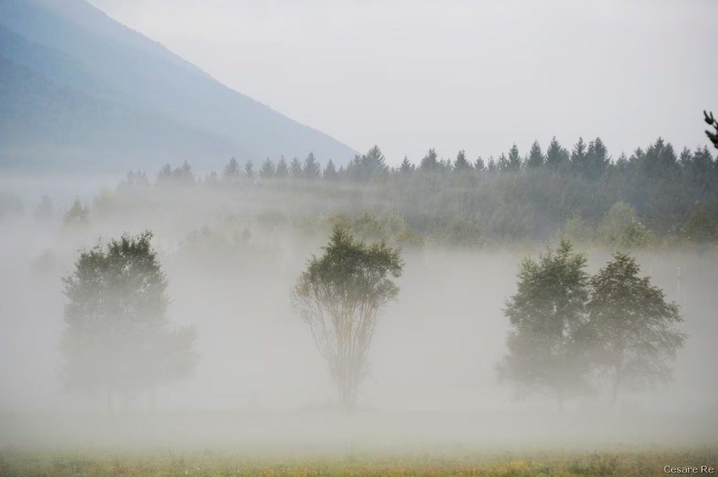 In Val Vigezzo, in una mattinata di fine settembre, con una forte inversione termica che crea l’effetto nebbia, nella piana della valle. Ho scattato diverse immagini, con diverse focali e cambiando obiettivo. Lo spettacolo della nebbia che danza tra gli alberi ha creato scenari continuamente diversi.