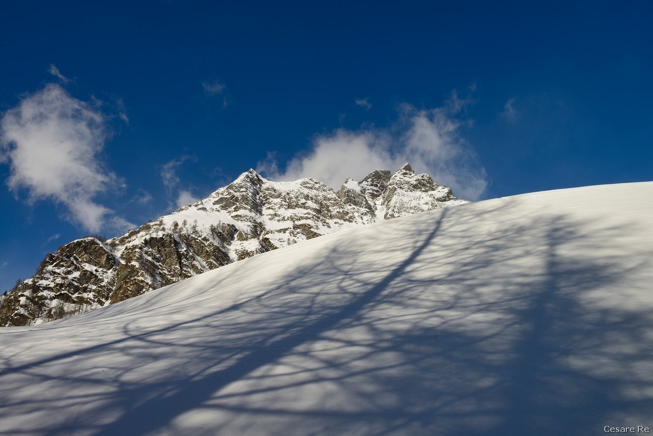 In pieno inverno, i larici se non sono innevati perdono fascino, dal punto di vista estetico. A volte, può essere interessante cercare di raccontarli in maniera diversa. In questo caso, ho sfruttato l’ombra dell’albero sulla neve. Il larice diventa quasi una linea guida che conduce l’occhio dell’osservatore verso la cima.