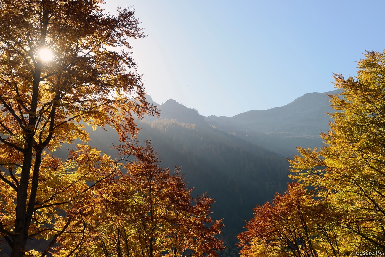 In Val Sorba, laterale della Valsesia, ci sono bellissimi boschi di faggio, una rarità nella zona, ricca soprattutto di larici e abeti. L’autunno diventa, quindi, il momento migliore per fotografare questi splendidi alberi. Salendo all’Alpe Sorbella, mi sono fermato moltissime volte per ammirare e fotografare questi soggetti, illuminati dalla luce dura e forte della stagione dei colori. Ho schermato il sole con il tronco e compensato leggermente l’esposizione per ovviare al controluce netto.