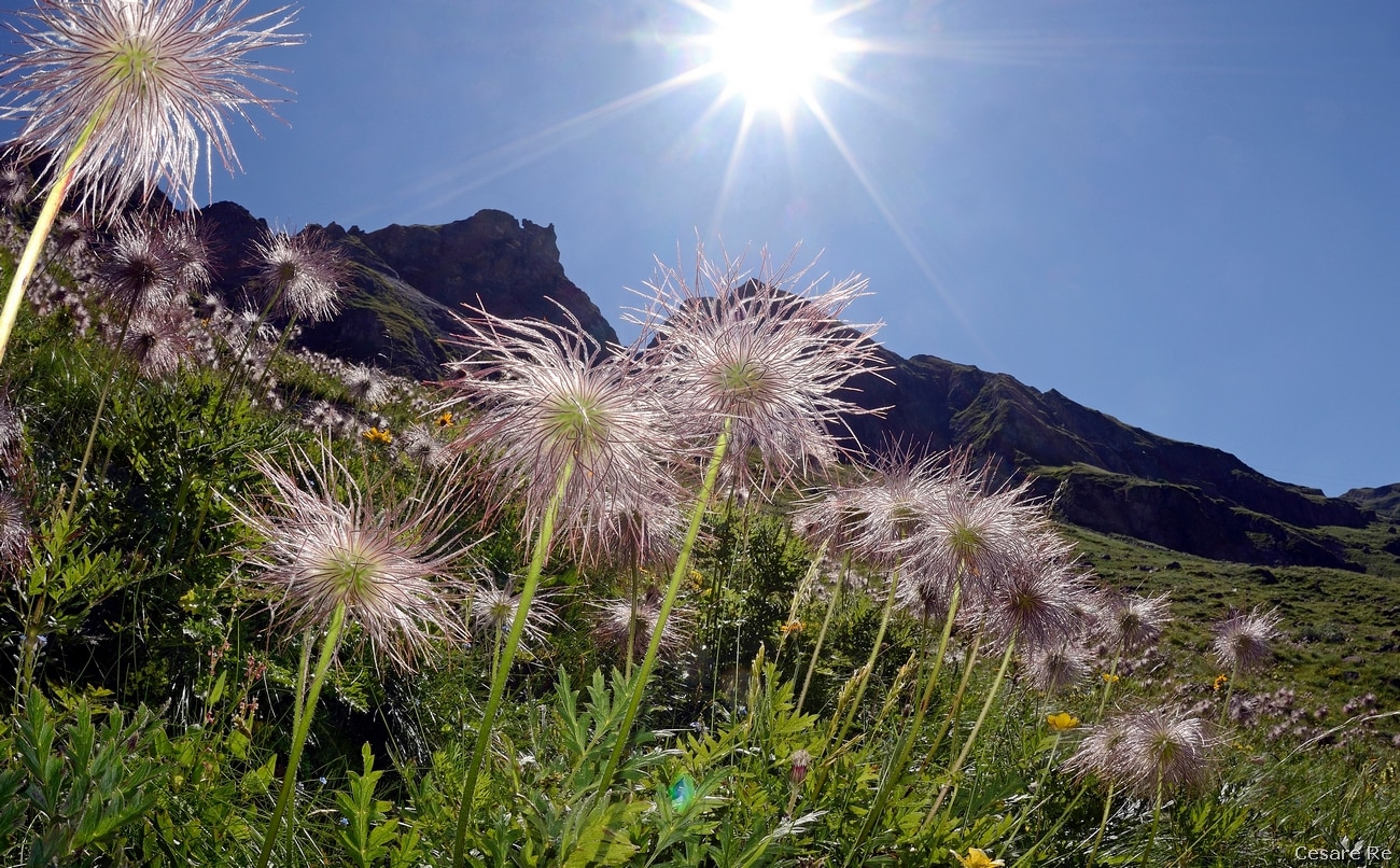 Il flash incorporato è quello presente sulla maggior parte delle fotocamere. È debole e, generalmente, in una posizione poco favorevole, poiché in asse con l’obiettivo. Senza il lampeggiatore, i fiori sarebbero risultati scuri, quasi neri, a causa del sole in inquadratura. Non avevo il flash che, altrimenti, avrei usato con il relativo cavo, staccato dalla fotocamera. Ho, quindi, utilizzato il flash incorporato della D800, come riempimento, per schiarire i fiori. Ho settato il Nikkor 24-70 alla focale minima e con diaframma f 16, in modo da ottenere: molta profondità di campo, il sole a stella e il lampo del flash debole, visto la vicinanza del soggetto. Gli ISO della reflex erano bassi, 100 iso, per ottenere: ottima qualità di immagine e lampo del flash debole, altrimenti avrei sovraesposto i fiori. Ho impostato la fotocamera in manuale, per misurare l’esposizione. Con f 16, il relativo tempo di posa era di 1/60 di secondo. La luce artificiale era uguale a quella ambiente. Ho illuminato sia il primo piano (dal flash), sia lo sfondo (dalla luce ambiente). In questo modo sono visibili sia i fiori, sia le montagne.