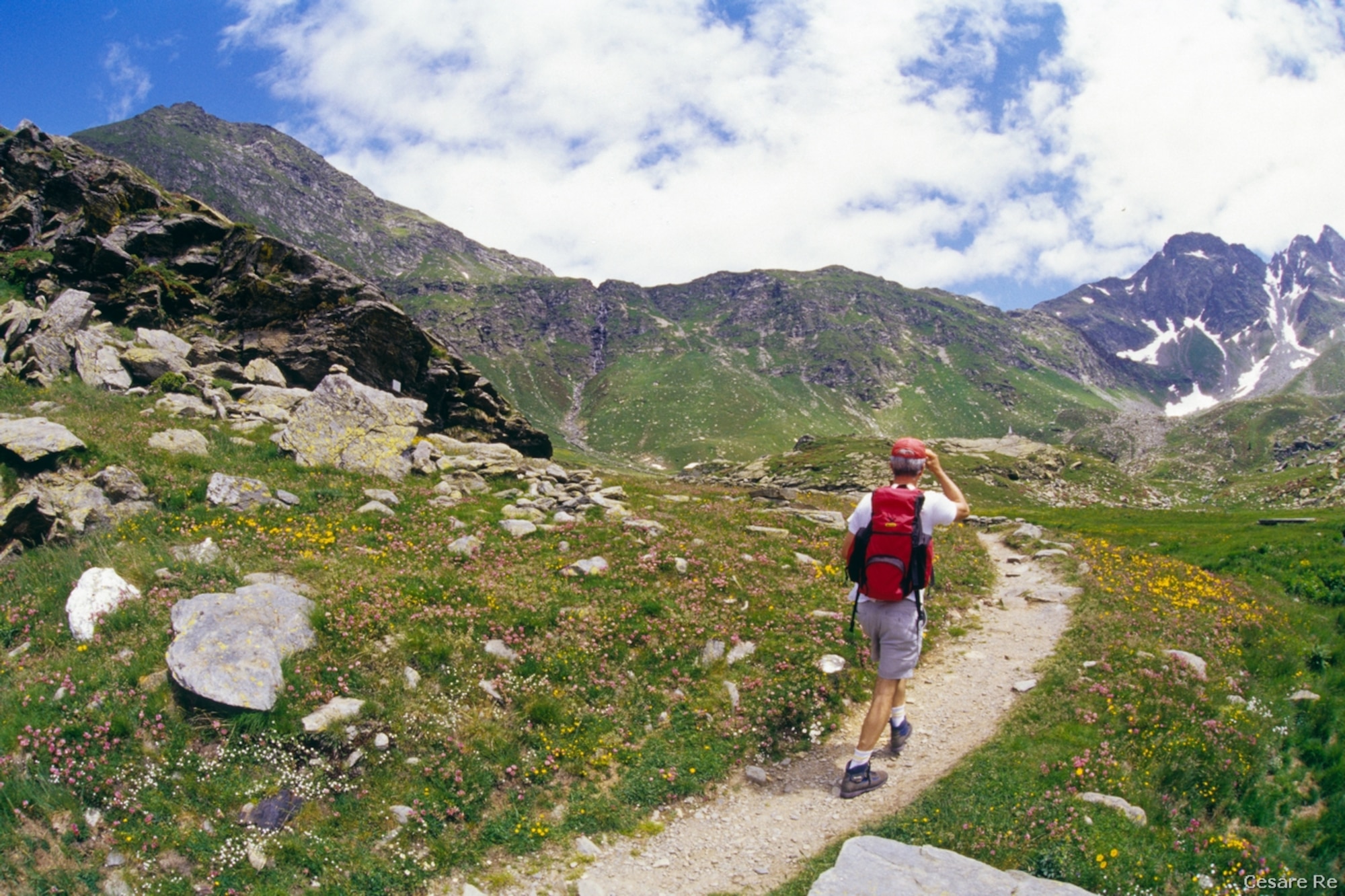 Si sale lungo la carrozzabile sterrata, si superano alcune case e si prende gradualmente quota, con docili tornanti che consentono un panorama interessante sulle montagne circostanti e sulle acque del sottostante lago. Si cammina lungo prati fioriti, impreziositi da piccoli specchi d’acqua, soprattutto di fusione in vista anche dei Laghetti degli Andossi (2058 m).